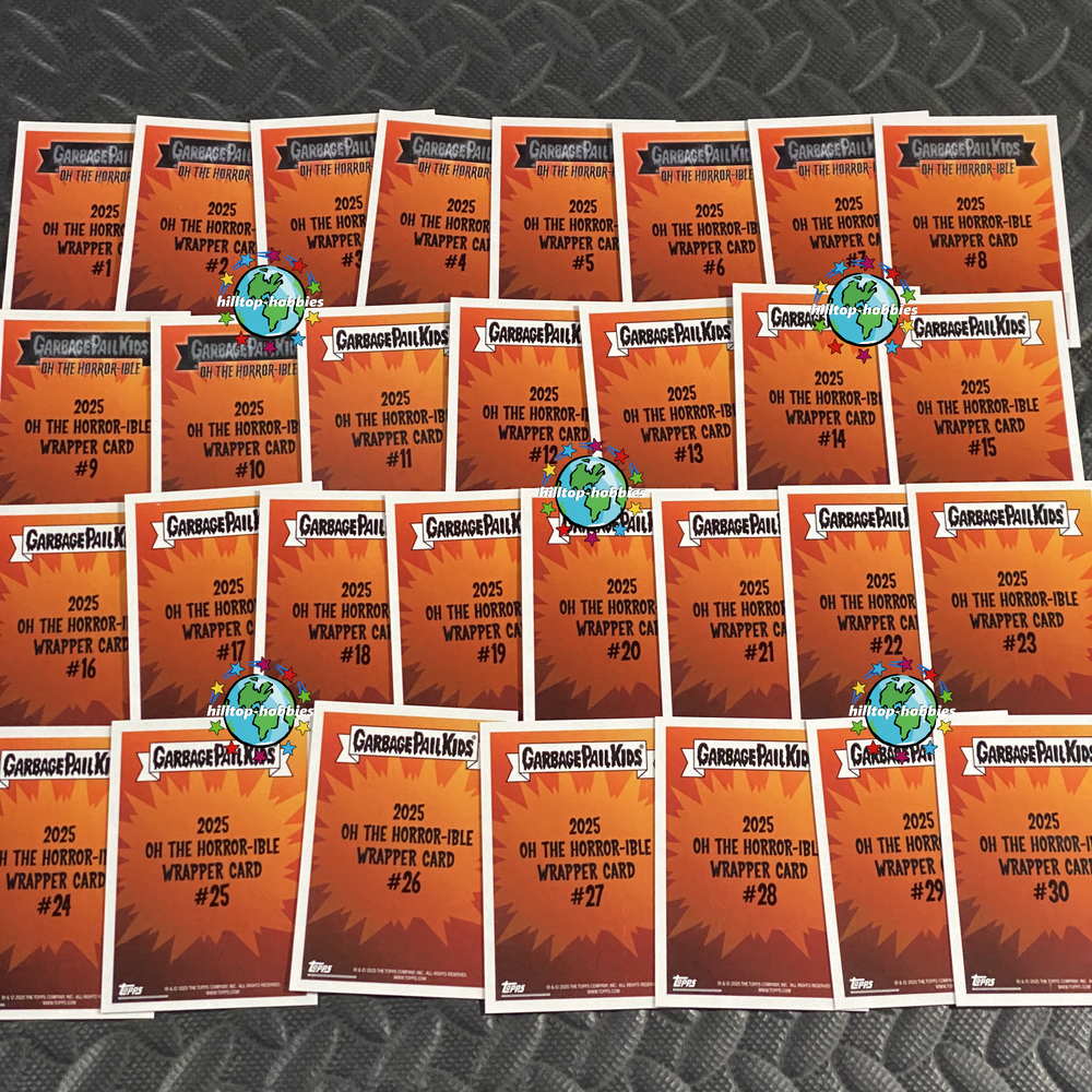 This listing is for a Garbage Pail Kids Oh, The Horror-ible Wave 1 through 6 complete "Wrapper Card" set from 2025. This set is from Wave 1,2,3,4,5 and 6 and includes all thirty wrapper cards, numbered 1 through 30. Any questions? Please ask before buying.