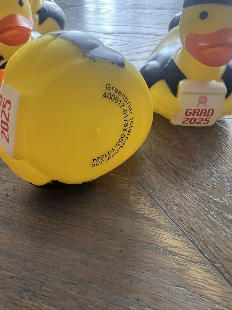 Celebrate the joy of graduation with this unique 2025 Graduation Rubber Ducky, an ideal addition to your party decorations. Adorned in a cap and gown, this black and yellow duck is a playful tribute to the milestone of completing a significant chapter of life. The contemporary style of this table decoration fits seamlessly into any graduation-themed event, adding a touch of fun and celebration. Crafted from durable plastic, this rubber ducky is not just a symbol of graduation but also a delightful gift for adults and children alike. The lot includes 5 units, each designed to bring a smile to faces under 5 years old. It’s a fresh and memorable way to commemorate the occasion without the worry of vintage or antique associations. Personalization is not available for this item.