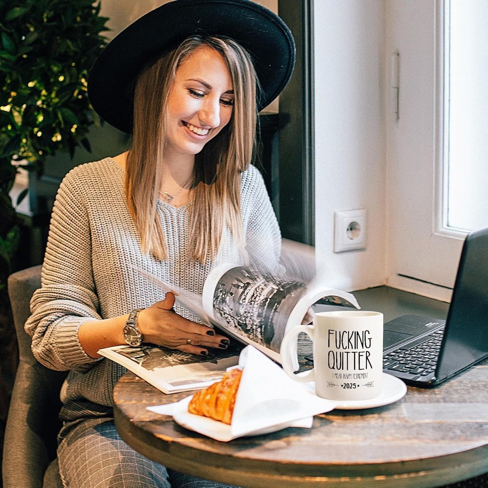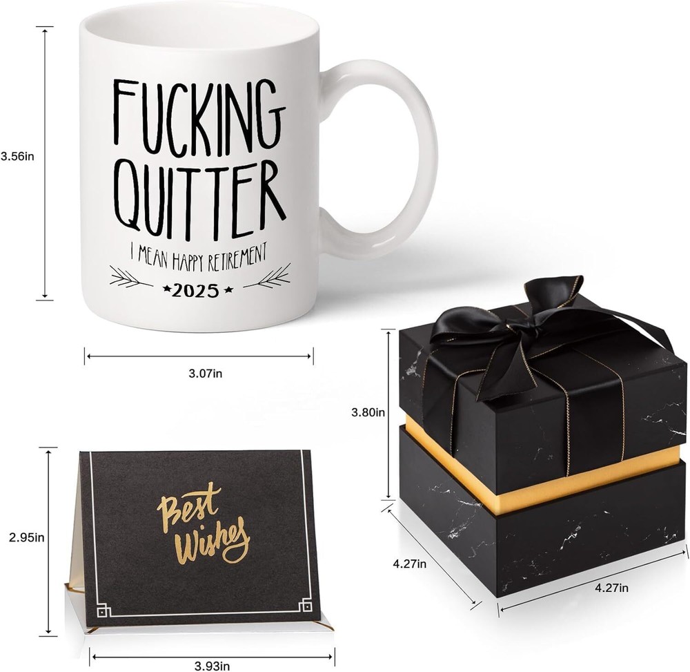 2025! 2025! 2025! 2024 FUNNY RETIREMENT GIFTS MUG: Superior quality retirement gifts for men and women, "Fucking Quitter I Mean Happy Retirement" sign coffee mug, Humorous retirement gifts are sure to be the talk of the retirement party. 2025 PRACTICAL RETIREMENT GIFT: Our coffee mugs are practical and funny retirement gifts, Custom Designed Retirement Coworker cup For Friends, Family and Coworkers.In the casual retirement life, Pick up a cup of coffee with the coffee cup you sent, enjoy the coffee. The owner will love this gift. FUNNY RETIREMENT GIFTS: This funny coffee mug is fired at high temperature and the ceramic is very resistant to high temperatures, the retirement mugs will not crack or crumble with hot or cold ice, the pattern on the coffee mug is printed with lead-free ink, Long Lasting, And Lead-free Design For Your Safety On Mar 31, 2025 at 20:58:47 PDT, seller added the following information: