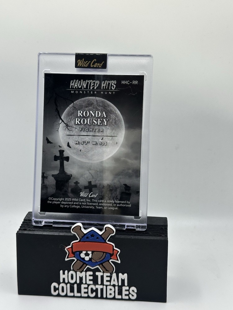 The product is a 2025 Haunted Hits trading card featuring Ronda Rousey, a mixed martial arts (MMA) athlete. This highly collectible card is a unique 1/1 edition, making it a rare and valuable item for fans and collectors. Fans of Ronda Rousey and MMA enthusiasts alike will appreciate adding this special card to their collection, showcasing a memorable moment from the world of sports trading cards.