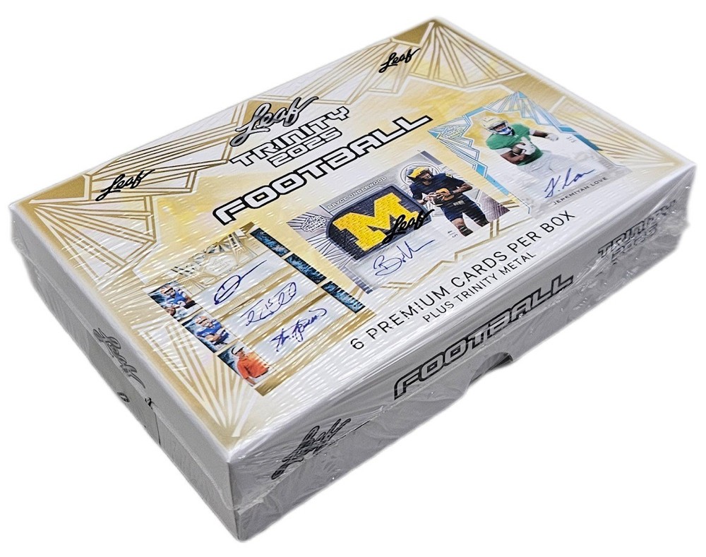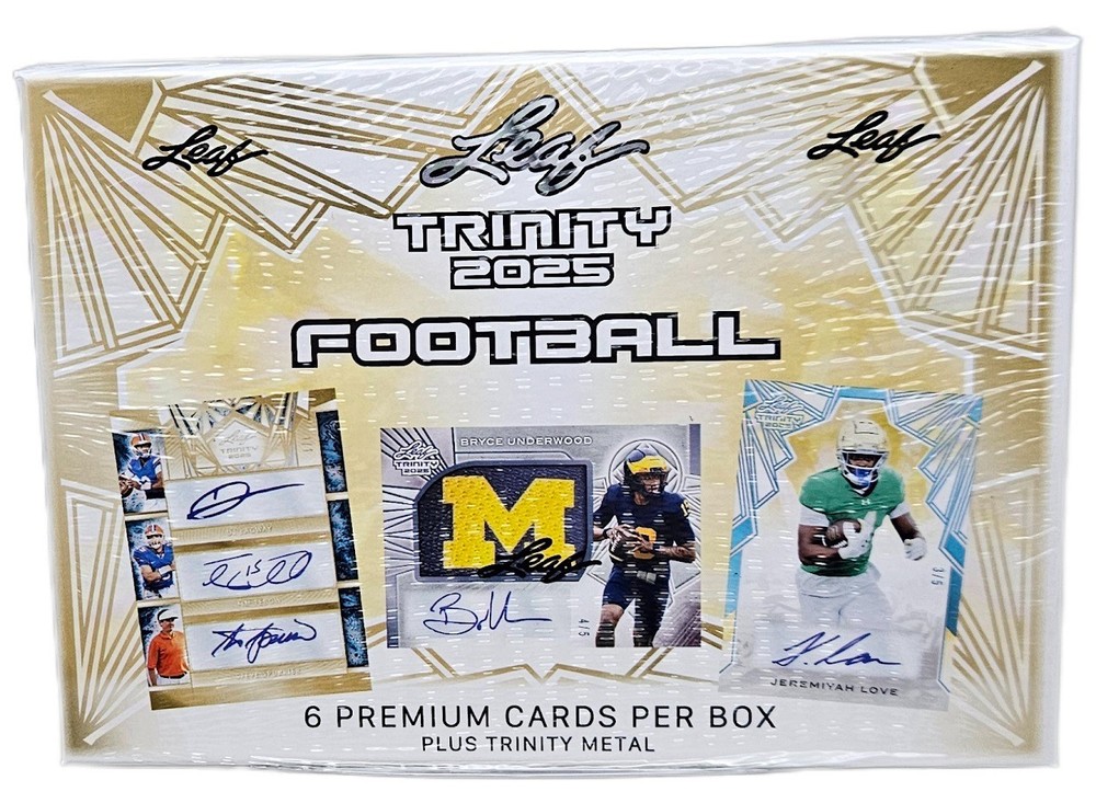 2025 Leaf Trinity Football - Sealed Hobby Box 1 Pack Per Box - 6 + 1 Cards Per Pack 6 Premium Cards Per Box Plus 1 Trinity Metal Card Leaf Trading Cards is proud to announce the 2025 edition of Trinity Football. Check out the following pages for exciting new content that will greatly enhance the Trinity experience. One of the drivers has always been the Auto Rookie Memorabilia for some of football's youngest stars. This year we kick it up a notch by adding in autograph game-used memorabilia from some of football's greatest of all time past and present. New for 2025, look for metal technology Trinity Auto Memorabilia cards of both young stars and legends. Trinity offers an amazing assortment of multi-signed cards that greatly enhance the value and chase to make all collector's experience memorable. Look for 3 signatures from the following names in each case: Ashton Jeanty, Bryce Underwood, DJ Lagway, Jeremiyah Love, LaNorris Sellers, Omarion Hampton, Sam Leavitt, Barry Sanders, Emmitt Smith, John Elway, Randy Moss, Patrick Mahomes, and Roger Staubach. Look for at least 3 multi-signed cards in every case. Look for HOBBY ONLY (1 per box) Metal Autograph Memorabilia Cards