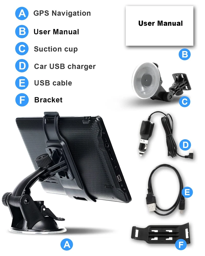 probably is the best choice of GPS Navigation for Cars ,RV, and trucks. Lifetime free map update Pre-load 2025 latest maps: United States, Canada and Mexico. About Europe UK Ireland Australia and other maps, email us to download with no cost. 1: after-service team in USA, supply all you may request. understand your concern of maps update and lifetime service. 2. Vehicle GPS Navigation System support postcodes, favourites addresses, point of interest, and satellite coordinates search. 3. probably is the best GPS navigation for cars and trucks. You can input the size and weight of your truck to optimize the routings. 4: You can use the FM transmitter of the GPS navigation, built-in FM transmitter can provide GPS sound to your car stereo. 5: This 7 inch GPS Navigation connect to computers only support Windows system. Do not use Mac computer to operate maps update, since the system is not compatible. You may want to know more, please ask question on this page. Specification Brand: System: Windows Screen: 7" capacitive touchscreen,800 * 480 Memory: Samsung 8 GB rom 256M Rom Support TF card up to 32GB Bluetooth: No AV IN: No USB Interface: USB 2.0, mini USB Battery: 3000mAh lithium battery Charging Time: 2-3 hours Charging Socket: 12V DC socket Car Charger: 12-24V/1.5A Package includes 1x GPS Navigation 1x Suction cup 1x USB cable 1x Car USB charger 1x User manual 【PRE-LOADED North America Maps】 Pre-installed with the 2025 latest North America Map, include USA Canada Mexico Maps, which has 2D / 3D map display. If you need to update the latest Map, please contact us to download. (Downloadable but not pre-installed maps: Europe, UK, Ireland, Australia and so on) 【Free Lifetime Map Updates 】 Get the latest map by connecting GPS Navigation to the Windows pc. You can also use an exteranl TF Card for map update (with Mac & Windows system). Lifetime Map is free updated without Ads . You can regularly download latest data for maps, speed, and points of interest. 【Driver Alerts】 7 inch GPS Navigation with detailed maps and turn-by-turn directions that speak street names loud and clear through the speaker. With GPS navigation system, you will never miss a turn or have to make sudden lane crossings. Support: (1)Postcodes, Address, Coordinates & POI (2) Driver Alerts, Active Lane Guidance assist, Active Speed Camera Detection (3) Street name Broadcasting, Turn-By-Turn Real Voice Broadcast. 【Professional GPS Navigation】 7 inch Touch Screen GPS Navigation for Car and Truck Motorhome & RV.(1) You can Customize Route According to Your Vehicle’s Weight, Length, Height and Width, Avoid Roads with Width/Height/Weight Restrictions (2) Intelligent Route Planning Fast & Economical. (3) Fast & Accurate GPS Tracking. (4) Displays Current Speed and ETA. 【Professional Solution】GPS navigation supply regular maps upgrades and any question inquiry. USA local brand, established professional technician team in the United States, have been recognized by our customers.