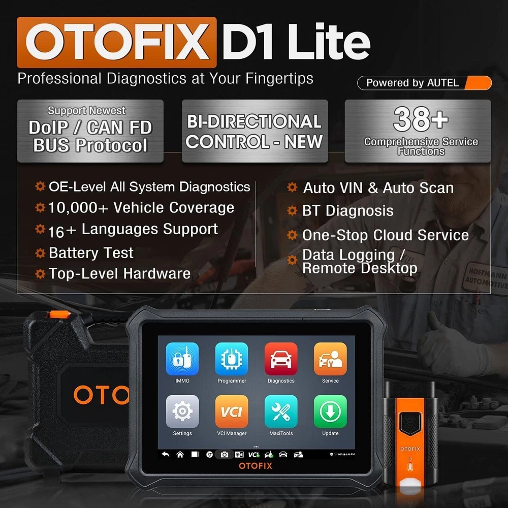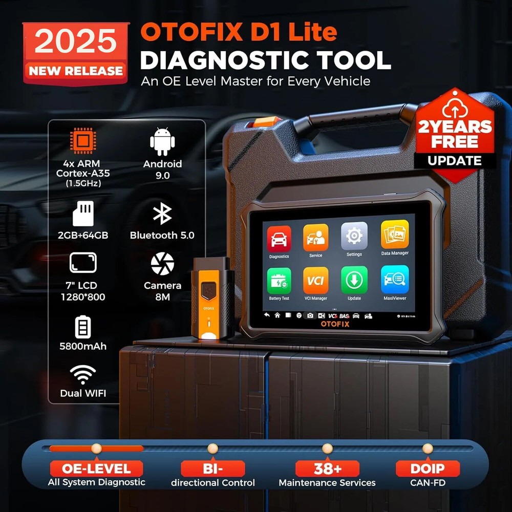 2025 OTOFIX D1 Lite Bidirectional Full System OBD2 Car Diagnostic Scanner Tool OTOFIX D1 Lite Bidirectional Scan Tool with 2-Year Updates, 2025 Newest All System Automotive Diagnostic Scanner, 38+ Reset Services, FCA AutoAuth, K~Y Programming, Active Test, CANFD&DOIP, Auto VIN OTOFIX D1 Lite VS Other Device For those who want to get the best-possible professional diagnostic tool, there is no other choice than the OTOFIX D1 Lite. This fantastic diagnostic scanner offers diagnostic and troubleshooting capabilities that are beyond the reach of most competitors: 👍 Upgraded Features - For this cost range you’ll get tons of features of next-level: not only basic but also many special and advanced functions that you won't find in many overpriced diagnostic tools. See details on the page. 👍 Better Car Coverage - Unlike many no-name diagnostic scanners which are limited to just a section of vehicle brands and support only models manufactured in specific years, the OTOFIX D1 Lite covers 99% mainstream cars worldwide (1996-2022 & newer), and its regular software upgrade meets the needs for most-recent models’ diagnostics. 👍 Smoother Navigation - The information menus are logically laid out, and instant one-touch response benefiting from a faster processor makes the OTOFIX D1 Lite an absolute breeze to use. Fast and intuitive as OE scan tools, yet only for 1/6th of the cost! About this item 🎄🏆 【2025 TOP OBD2 Scanner Diagnostic Tool】 OTOFIX D1 Lite wireless obd2 scanner has upgraded hardware configuration and car coverage. The newly upgraded D1 Lite with 🔥OS Android 9.0🔥1.5Ghz 4 core high efficiency processor🔥2GB RAM+64GB ROM large storage🔥5800mAh large battery, more stable and longer lasting diagnostics🔥 38+ Reset🔥action tests🔥full system diagnostic🔥Supports MV105 endoscope🔥21+ Language Supports🔥100000+ vehicle coverage to meet all your daily maintenance needs. 🎄👍 【 Bi-Directional Control / Active Test】 D1 Lite obd2 scanner has bidirectional control(worth $300+), which is the most beloved feature among mechanic. If your headlights or car windows are broken, going to a repair shop will cost a lot of money. You can use D1 Lite to send execution commands to the ECU module and identify the repair status. Such as ABS, car windows, doors, valves, wipers, headlights, etc., effectively shorten diagnostic time and reduce diagnostic costs. 🎄🔥 【 All Systems Diagnostics , In-depth Checking】 This advanced OBD2 Scanner D1 Lite can perform OE-level diagnosis of all systems including engine, transmission, airbag, ABS, ESP, TPMS, immobilizer, gateway, steering, radio, and air conditioning for more than 100 brands. This diagnostic scanner supports essential functions, such as reading ECU version info, reading and clearing fault codes, and reading data streams.With just a simple click, it provides you with accurate and in-depth diagnostics. 🎄🏆 【38+ Reset Hot Functions】 For repair workshops, holding an OTOFIX D1 Lite Auto scanner is a strong advantage over others. Its 38+ maintenance functions provide various solutions for all module repairs, including Oil Reset, TPMS Reset, Injector Coding, Suspension, Throttle Matching, etc., which will usher your repair business to a new pinnacle. Continuously updating will never make the functionality & compatibility out-of-date. 🎄🏆 【 150+ Models, 10000+ Car Coverage & 16 Languages】 D1 Lite is a comprehensive diagnostic tool, help you to troubleshoot car issues fast for 95% US, European, Asian auto makes. ✅ With frequent updates and optimizations allow D1 Lite to cover more vehicles to meet your needs. ✅ Multilingual menu allows auto mechanics around the world to use it without language barriers. 🚩Note: Kindly send us the S/N of the device to authorize new language updates before changing the menu language. 🎄🔥 【Upgraded V1 Bluetooth5.0】 OTOFIX D1 Lite is equipped with the V1 Bluetooth connector, which supports CAN-FD and DOIP. This automotive diagnostic scanner supports compatibility with with GM Cavalier, Trax Encore & Volvo after 2018, LanRover/Jaguar after 2017, and more.It can work on over 99% of worldwide vehicles from diverse brands,even some luxury brands e.g. compatible w/ Maserati,Ferrari, Mercedes,etc. 🎄👍 【2 Years NO-FEE Updates 】Keep this automotive scanner diagnostic tool up-to-date with software subscriptions, free for 2 years, with much higher update frequency than similar scanners for cars on the market. Product Description OTOFIX D1 Lite : 2025 Most Worthwhile Bluetooth OBD2 Diagnostic Scanner ————🙋♂️🙋♂️Want an OBD2 scanner diagnostic tool to serve you well with all unnecessary features?Don’t want to spend too much that is way above your budget? ———👍👍Then, OTOFIX D1 Lite is a wonderful car scanner to consider. OTOFIX D1 Lite in 2025: Cover More for More Business, Yet No Bigger Price-Tag It’s perfect for auto repair experts. Combined with 99% basic, advanced, and high-end functionalities covering 99% models worldwide, this car diagnostic scanner allows you to conveniently diagnose, research, and repair vehicle issues all in one place. Let’s explore the details: [Extreme Vehicle Coverage] 150+ car brands, 10000+ models across the global made from 1996 to date. Also support car protocols of tomorrow: 1) CAN-FD , compatible with 2020 & newer G.M & Chrysler Models; 2) DoIP , compatible with Volvo, Land Rover/Jaguar, BM.W F/G Chassis, and more. [Dealership-Level Diagnostics] Give quick access to the most common 38+ service functions , still expanding to support more resets & relearns and more cars // Bi-directional Active Tests verify working status of car components on demand. Results will be shown in minutes. // OE-Level All System Diagnostics build a communicating bridge to 99% OBD2 cars’ accessible computers and modules to read/clear codes, reset kinds of dashboard lights and display live data in text, graph 
