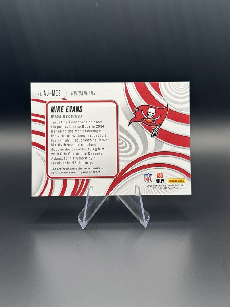 The product is a 2025 Panini Absolute sports trading card featuring an authentic jumbo patch of Mike Evans from the Tampa Bay Buccaneers. This card is part of the 2025 Panini Absolute set and is authenticated by Panini Authentic. The card is a valuable memorabilia item for fans of the National Football League and collectors of football trading cards.