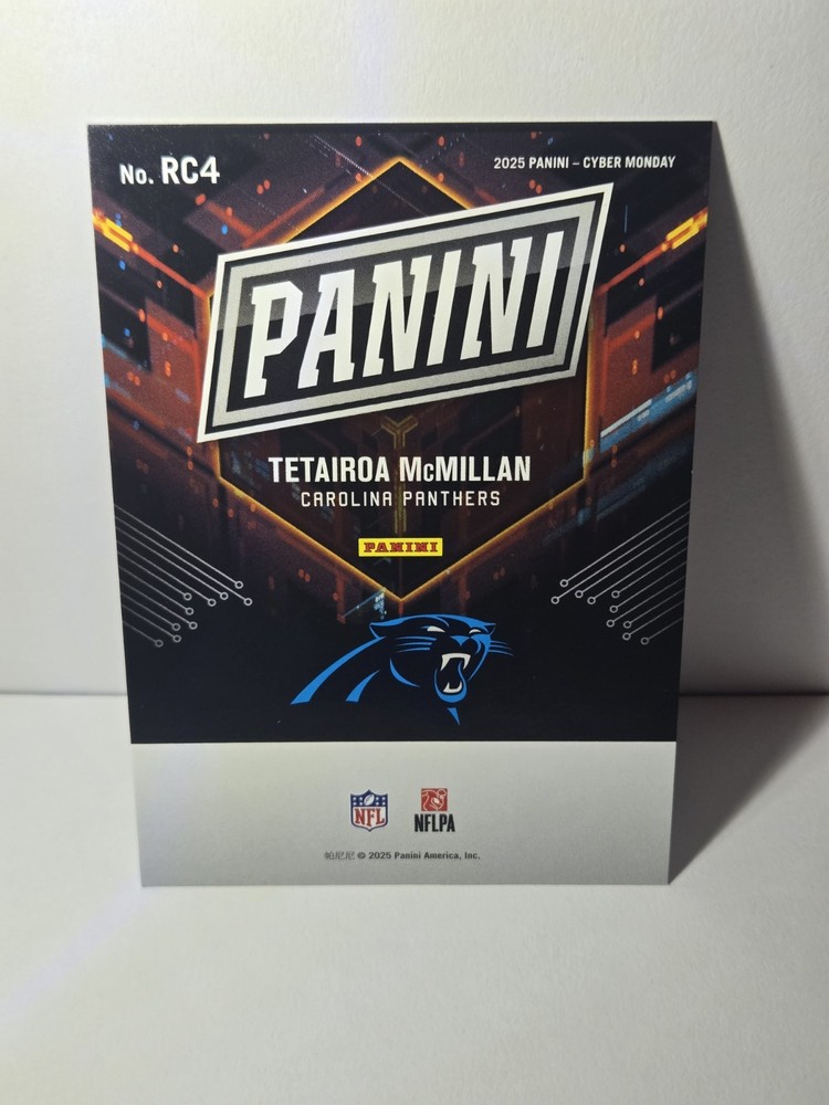Team:Carolina PanthersCard Condition:Near mint or betterCard Number:RC4Type:Sports Trading CardYear Manufactured:2025Country of Origin:United StatesLanguage:EnglishCard Name:Tetairoa McMillanPlayer/Athlete:Tetairoa McmillanPrint Run:99Insert Set:RookieCard Size:StandardManufacturer:PaniniSport:FootballLeague:National Football League (NFL)Set:2025 Panini Cyber MondayParallel/Variety:[Base]Material:Card StockOriginal/Licensed Reprint:OriginalSeason:2025Features:Rookie, Insert, Serial Numbered