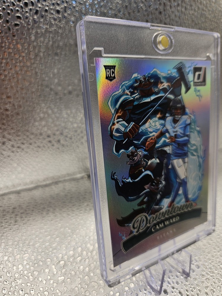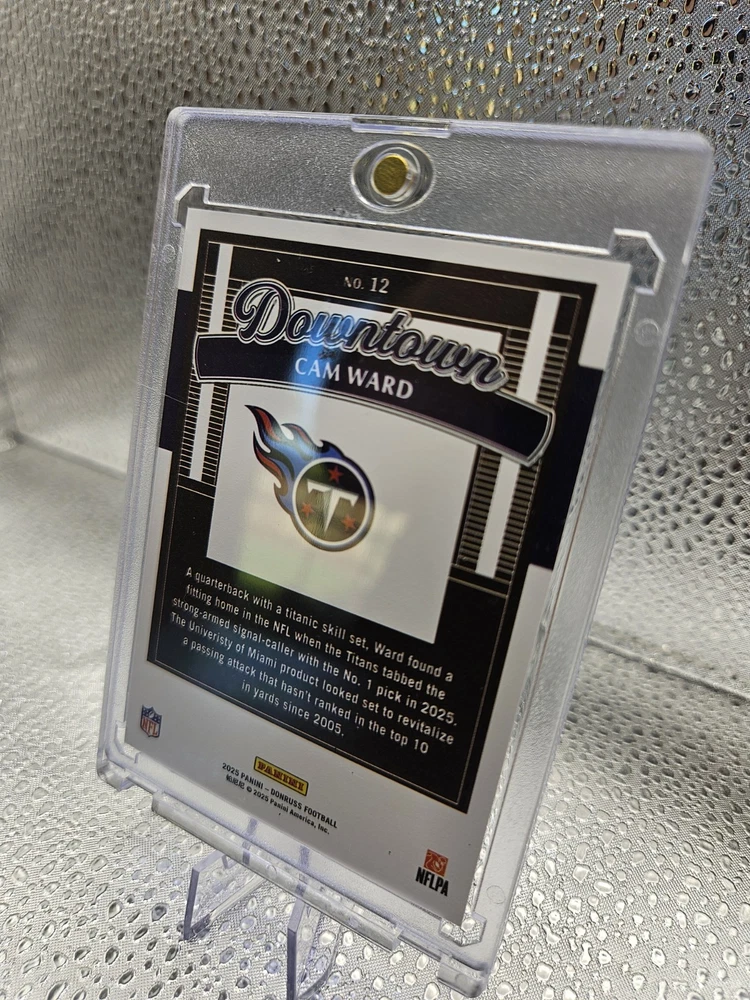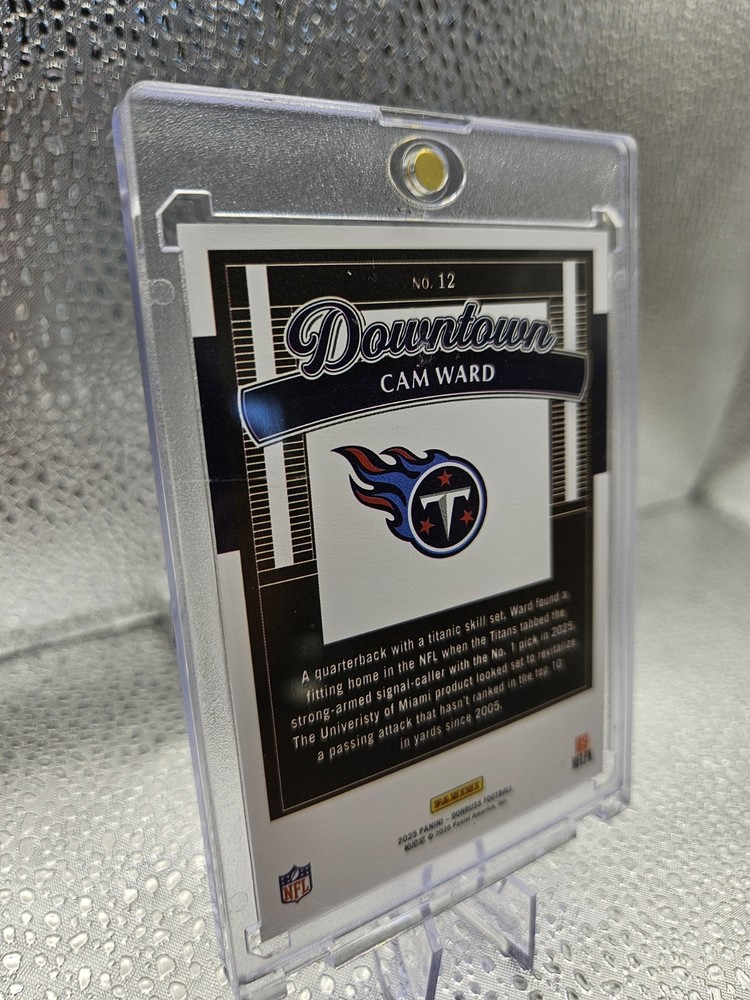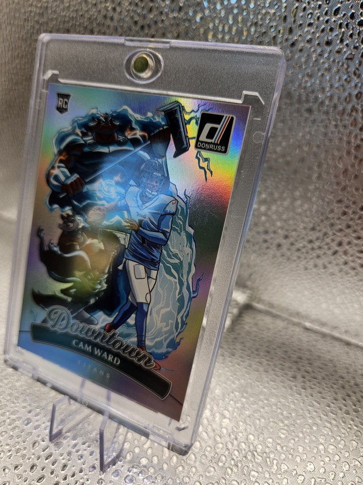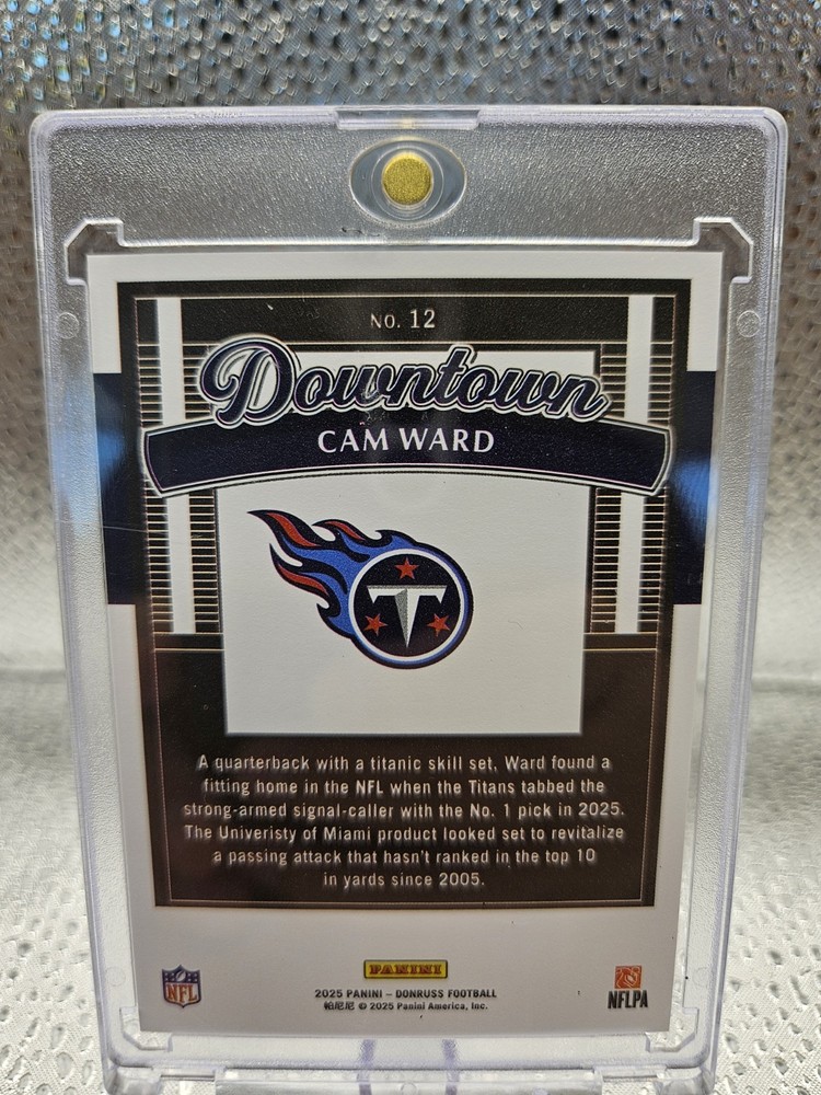 The product is a 2025 Panini Donruss sports trading card featuring Cam Ward of the Tennessee Titans. This rookie card is part of the Downtown! set and is autographed by Cam Ward with authentication by Donruss. The card is in near mint or better condition and is ungraded. Cam Ward is a football player who is a rookie for the season 2025, making this a valuable addition to any sports trading card collection.