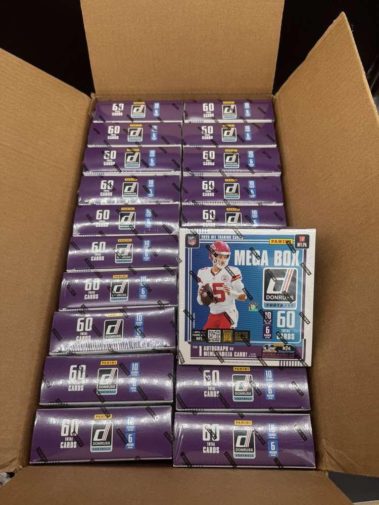 The 2025 Panini Donruss NFL Mega Box LOT OF 20 FULL OPENED CASE contains standard-sized trading cards featuring players from the National Football League (NFL). This set includes cards of notable athletes like Patrick Mahomes, with autographs in the form of labels or stickers. The cards are made of card stock and come in a box configuration, making them perfect for football fans looking to add to their collection. With features like Rookie, Parallel, and Chase cards, this set is a must-have for any NFL trading card enthusiast.