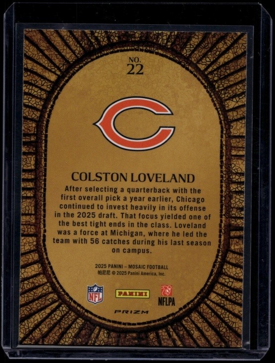 The 2025 Panini Mosaic Football Colston Loveland #22 RC Rookie Micro Mosaic card is a must-have for any NFL collector. This highly sought-after rookie card features a dynamic design and unique micro mosaic pattern. Don't miss out on adding this rare and valuable card to your collection!