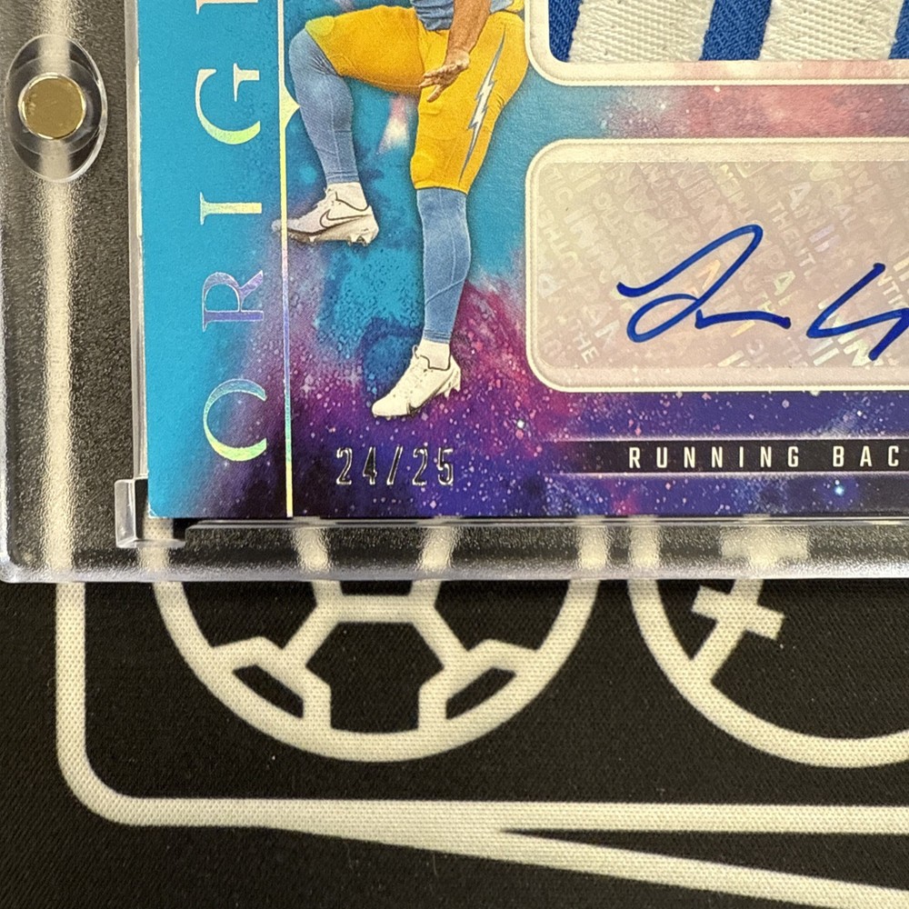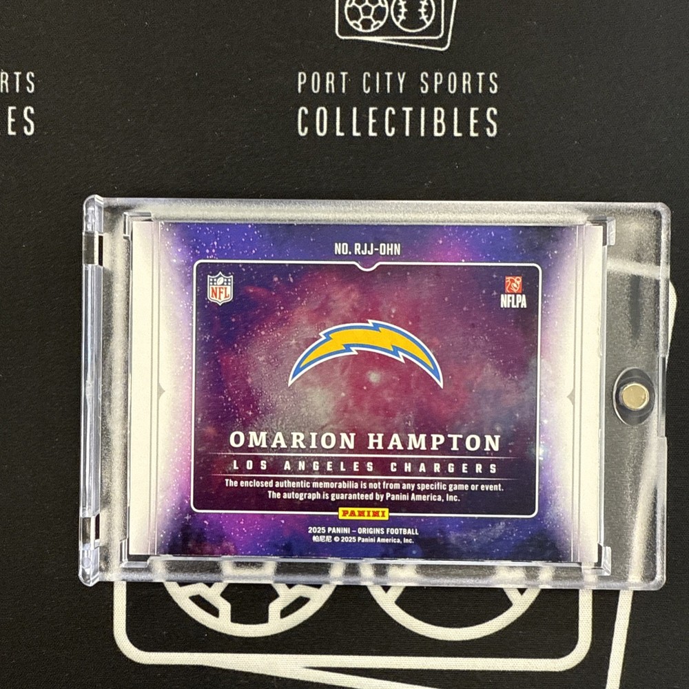 The product is a 2025 Panini Origins Football Rookie Booklet Patch featuring Omarion Hampton. This sports trading card is made of paper and showcases a patch as well as the rookie's autograph. It is serial numbered 11/25, making it a limited edition collectible item. The card is in standard size and is written in English, making it a desirable addition for football card collectors, especially those interested in rookie cards and memorabilia.