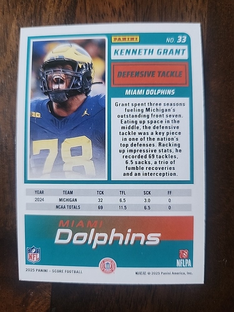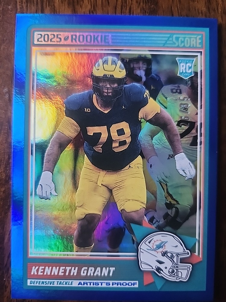 The 2025 Panini Score Rookies SP Artist's Proof 26/35 Kenneth Grant #33 Dolphins trading card is a collectible item featuring the rookie player Kenneth Grant from the Miami Dolphins. This card is part of the 2025 Panini set and is an original piece made of card stock with a 20 Pt. thickness. It is in near mint or better condition, ideal for fans of NFL and football trading cards looking to add a rare and unique item to their collection. The card is a valuable piece for those interested in football memorabilia and the career of Kenneth Grant. Ships with sleeve in top loader. USPS Ground Advantage.