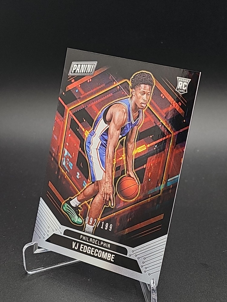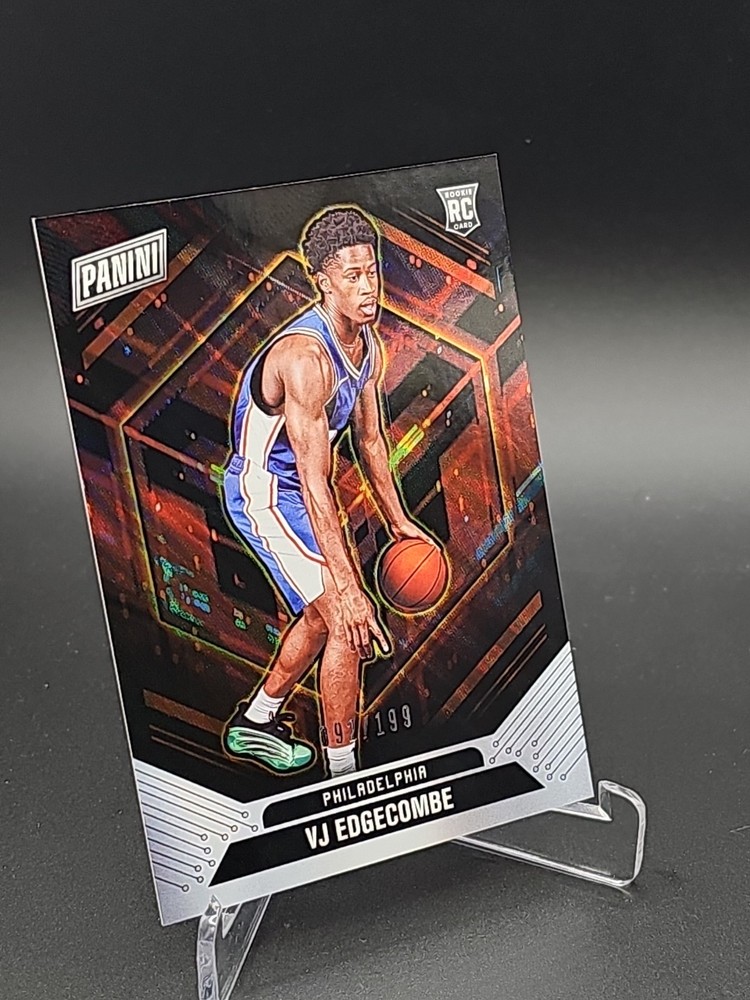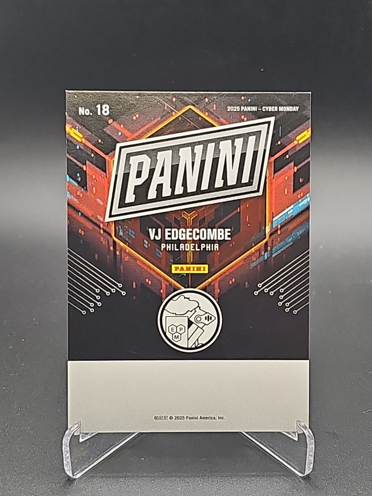 The 2025 Panini VJ EDGECOMBE Cyber Monday RC /199 trading card is a highly sought-after collectible item for basketball fans. This original card features VJ EDGECOMBE from the Philadelphia 76ers, part of the 2025 Panini set. Made of card stock with a thickness of 20 Pt., this hard-signed card is a rookie edition that is serial numbered for authenticity. It is perfect for fans looking for a unique piece of NBA memorabilia from a specific season and player.