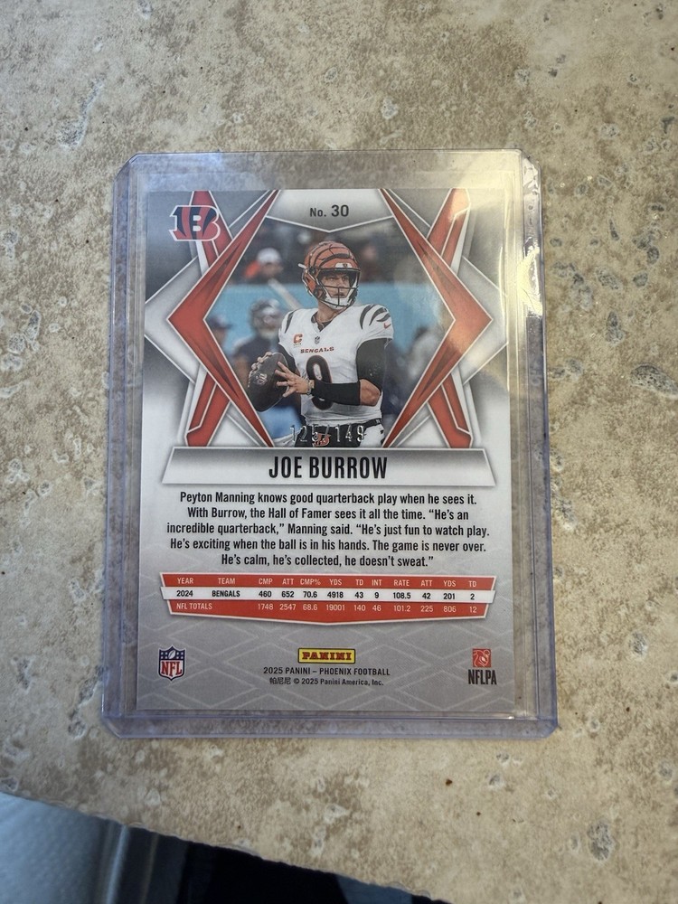 The 2025 Phenoix Joe Burrow Case Hit Silver #30 /149 is a highly sought-after sports trading card featuring football player Joe Burrow from the Cincinnati Bengals. This limited edition card, manufactured by Panini, is part of the 2025 season collection and showcases a unique design as part of the Phenoix series. With only 149 cards produced, this rare collectible is a must-have for any NFL card collector looking to add a valuable piece to their collection.