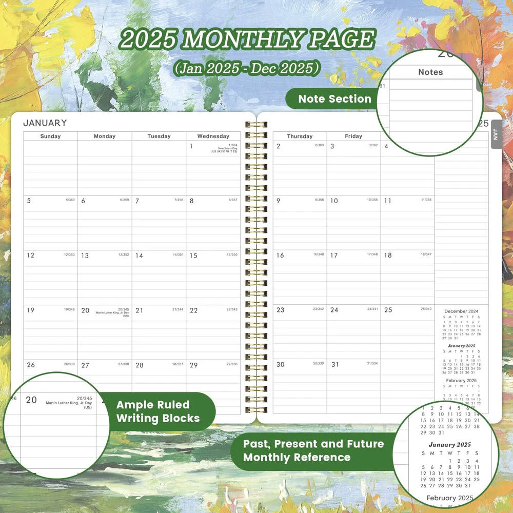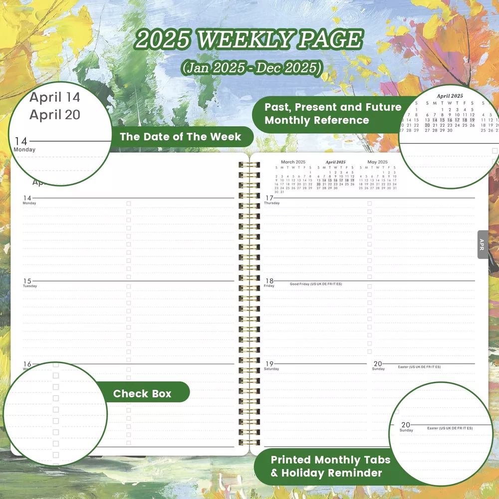 ☘️ Planner 2025 - This 2025 calendar planner is designed to span the entire year of 2025, from January to December 2025. With dimensions of 8" x 10", it's perfectly portable, making it an ideal choice for students to toss in their backpack or professionals for their daily commute. ☘️ Monthly Planning Reimagined - Navigate through the months with our clear monthly planning pages. Each page offers a broad view, with each day's space measuring 1.65" x 1.69", perfect for jotting down appointments and tasks. A reference calendar for the past, present, and future months aids in extended planning. Plus, a dedicated note section and marked holidays keep your important dates and creative thoughts in check. ☘️ Weekly Planning Reinvented - Dive into the weekly planning pages, designed with ample lined space to list your tasks from Monday to Sunday. Complete a task? Tick it off with satisfaction. These pages provide a clear and concise weekly layout, ensuring you never lose sight of your daily agenda. ☘️ Elegant Aesthetics for the 2025 Planner - Crafted with a touch of sophistication, the 2025 monthly planner boasts a flexible cover depicting a serene golden autumn scene, offering a pleasant experience. Durable twin-wire binding and rounded corners enhance its sturdiness and portability, making it a reliable tool for your daily planning needs. ☘️ Ideal for Students & Office Workers – Students will find this planner 2025 a great tool for keeping track of their academic calendars, assignments, and exam schedules. Office workers can use it for meeting minutes, project timelines, and personal goal setting. It can also be given as a gift to friends, classmates, and friends who like to write by hand.