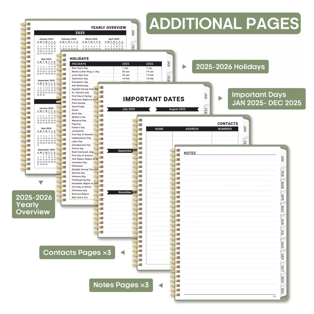 2025 Planner Overview: Our aesthetic planner covers the period from January to December 2025, featuring 12 monthly pages and 53 weekly pages to help you easily organize the entire year, making it an essential supply for office, home, and school. Monthly Planner: Features previous and next month reference calendars, major holidays reminders for long-term planning, daily writing blocks and a dedicated notes section for important projects. With monthly tabs and motivational quotes, it's designed to inspire and organize your life, work, or study. Weekly Planner: Our agenda book planner 2025 features each two-page weekly spread, from Monday to Sunday, offering ample lined writing space. It also includes popular holidays, two-month reference previews, and a dedicated priorities area, making it easy to manage appointments, notes, and daily tasks. Paper to Meet Your Needs: Our premium thick paper not only prevents ink bleeding, allowing you to use your favorite pen on the planner, but also provides a smooth writing experience. Distinct Design: The strong spiral binding ensures the planner's durability. It also offers dedicated sections for notes, a 2025-2026 yearly overview, holiday reminders, dual-pockets, and more, making it a perfect planner for women, men, teachers, and students.
