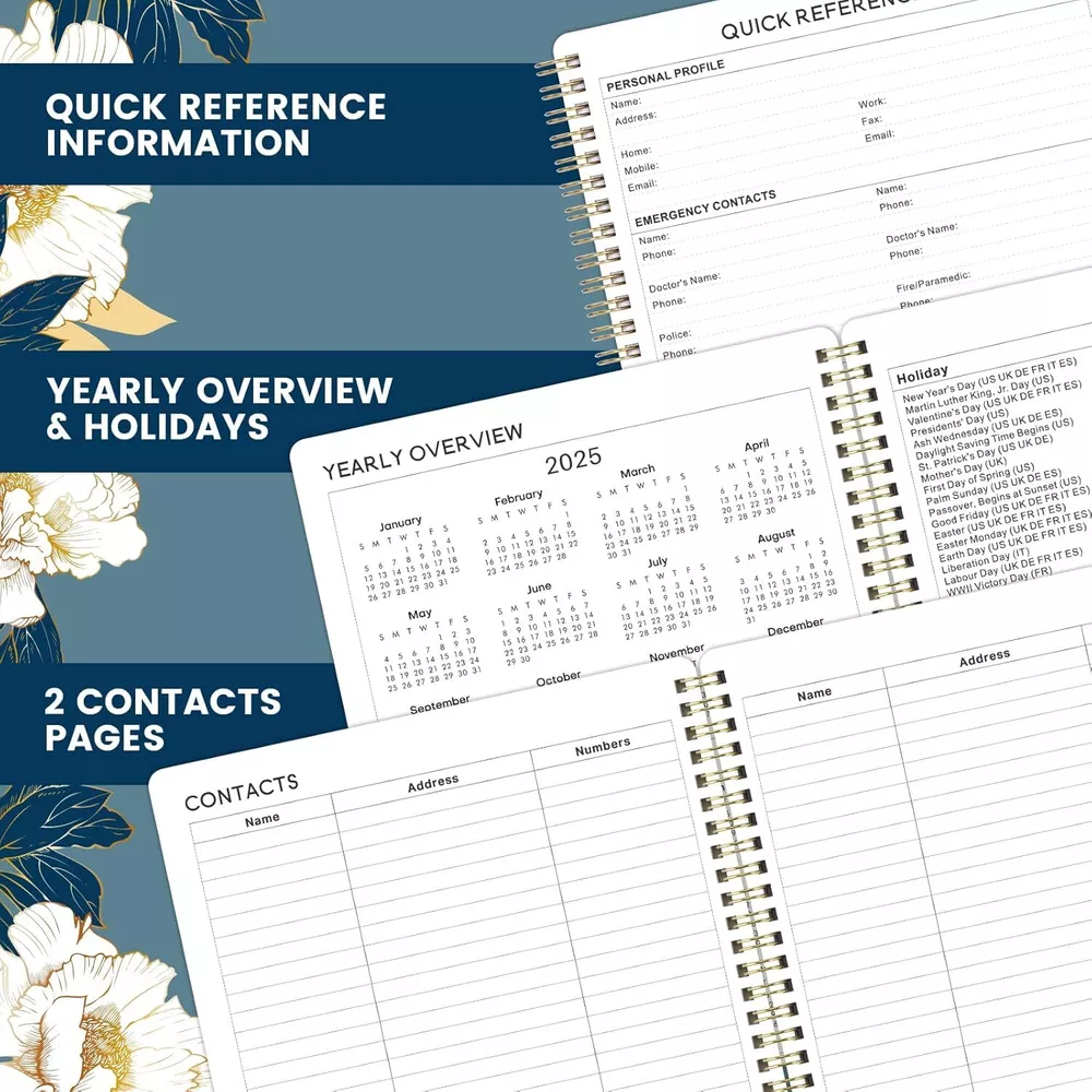 2025 Planner - JAN 2025 - DEC 2025, Weekly Monthly white, gold Product Details Manufacturer: Tersus Brand: Tersus Item Weight: 11.7 ounces Package Dimensions: 9.76 x 7.76 x 0.43 inches Color: white, gold Cover Material: Cardboard Material Type: Cardboard Ruling: horizontal Sheet Size: 8x10 inches Manufacturer Part Number: TS810LHJBHDZYXQ25 Brand: Tersus Color: white, gold Cover Material: Cardboard Year: 2025 Format: Notebook, Organizer Calendar Type: Gregorian Target Audience: Adult Sheet Size: 8x10 inches Material: Cardboard Item Weight: 0.33 Kilograms ⭐ JAN 2025 - DEC 2025 - This 2025 planner is from January 2025 to December 2025, including 12 months of monthly and weekly pages, helpful for daily planning. The size of the calendarplanner 2025 with floral pattern cover measures at 8" x 10", which is suitable to carry to office or school. ⭐ Clear Monthly Plan - Each monthly page of this planner 2025 has an overview of the month and ruled daily blocks for your monthly planning. The page contains holiday reminders, reference calendars and notes section. It can improve the likelihood of accomplishing your goals. ⭐ Detailed Weekly Plan - Each weekly page of this 2025 weekly and monthly planner includes enough writing space to prioritize work. When complete a task, you can put a tick in the checkbox to enhance your strong sense of accomplishment. ⭐ Perfect Design - The elegant design of this weekly and monthly planner 2025 is constructed with blue background and white flowers, which makes it more classic and fashionable. Strong twin-wire binding and round corner design keep it convenient to use. ⭐ Featured - 8" x 10" Monthly and Weekly Pages | Quick Reference Information | 2025-2026 Yearly Overview | 2025-2027 Holidays | Contact Pages | High Quality Paper | Twin-wire Binding |.