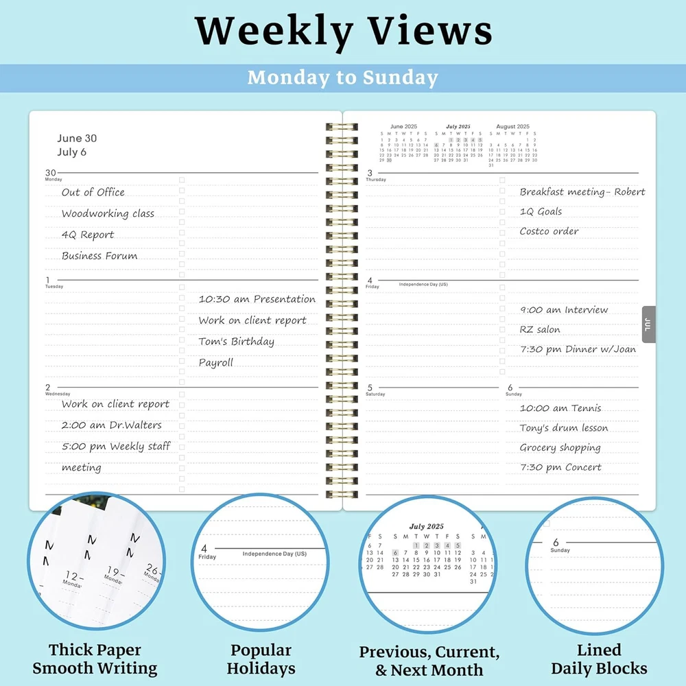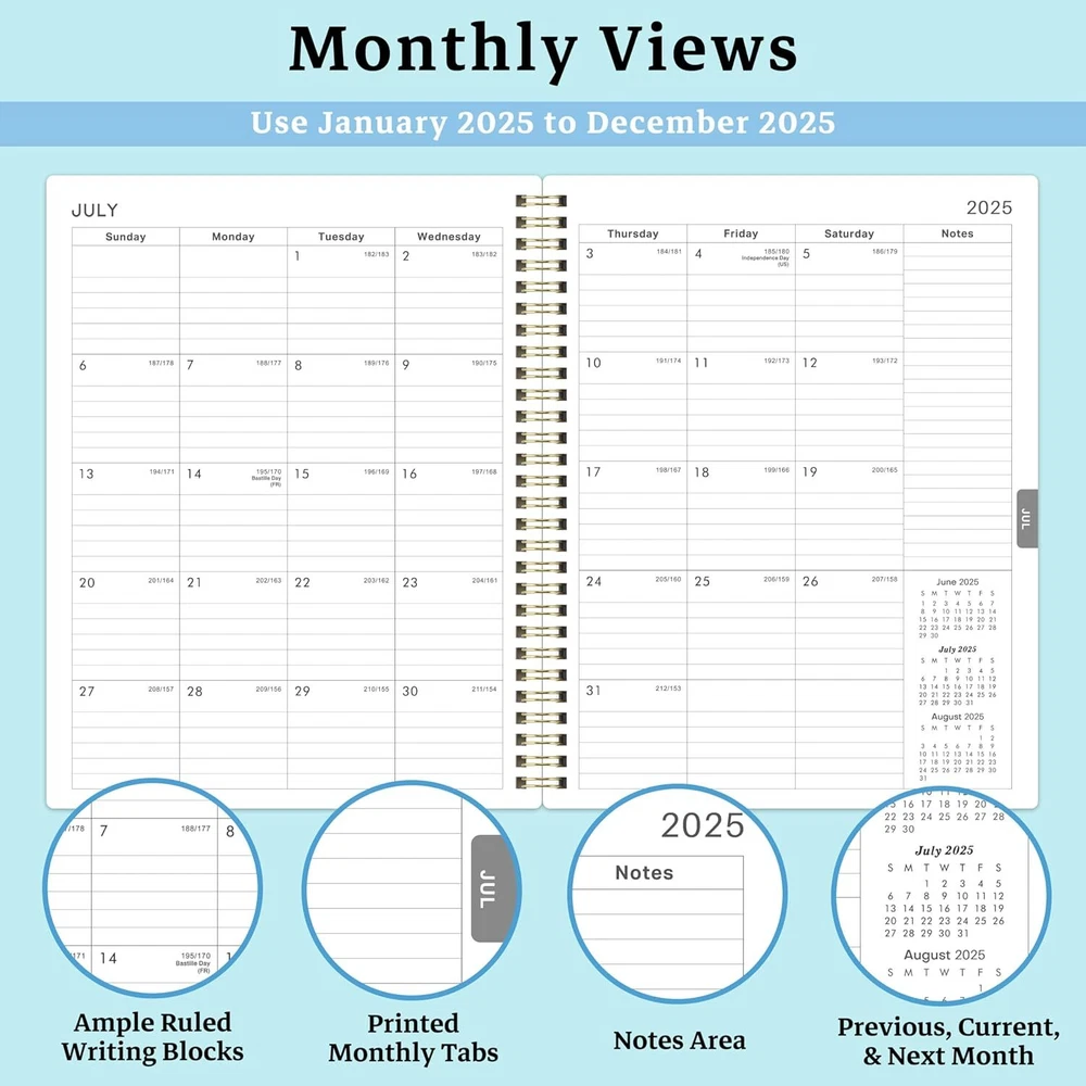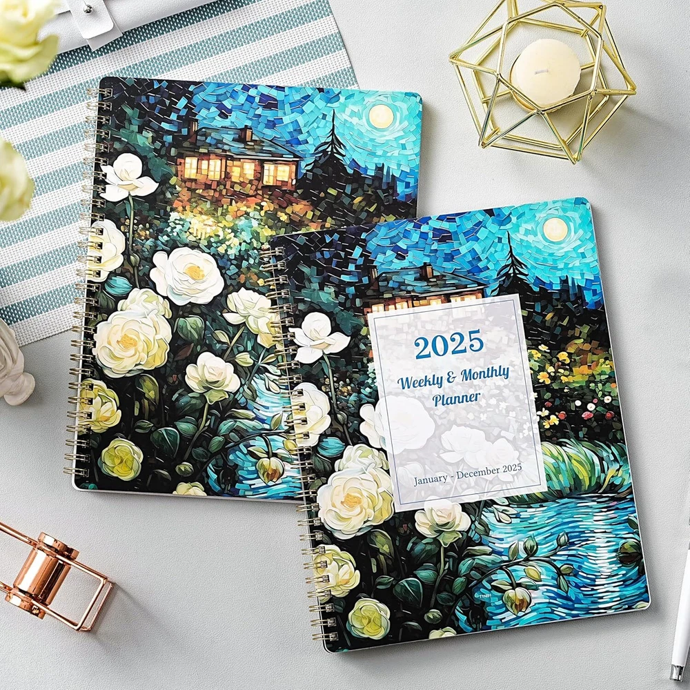 2025 Planner - Weekly & Monthly 2025, Runs from Jan 2025 multicolor Product Details Brand: Feteulo Color: multicolor Cover Material: Metal Year: 2025 Format: Organizer Calendar Type: Monthly & Weekly Target Audience: Adult Sheet Size: 8 x 10 Material: Metal Binding: Unknown Binding PLANNER OVERVIEW - From Jan 2025 to Dec 2025, 8" x 10", with 12 months of monthly and weekly pages for easy planning and scheduling. The 2025 planner with monthly tabs will make your daily life more vividly and make your organizing a breeze. MONTHLY PAGE - Each monthly spread of the 2025 planner contains an overview of this month and a notes section. The festivals are highlighted in the pages as well to remind you of the important dates. It also gives a reference of the previous and next month calendars for a simple past reviewing and future planning. 2 Page Monthly Spreads followed by 2 Page Weekly Spreads. HIGH-QUALITY PAPER – Plan your schedule without fear of distracting ink bleeding. Our improved, high-quality paper is designed for superior ink bleed resistance, which keeps plans neat and legible. SPECIAL FEATURES - 8" x 10" Planning Pages | Yearly Overview | 12 Monthly Tabs | Holidays Reference | Contacts Page| Twin Wire Bound Lays Flat | Premium Thick Paper PERFECT ORGANIZER - To arrange time is to save time. This 2025 planner is all you need to keep things organized. It will help you schedule all your appointments and daily activities, plan events, set goals and get thins done!