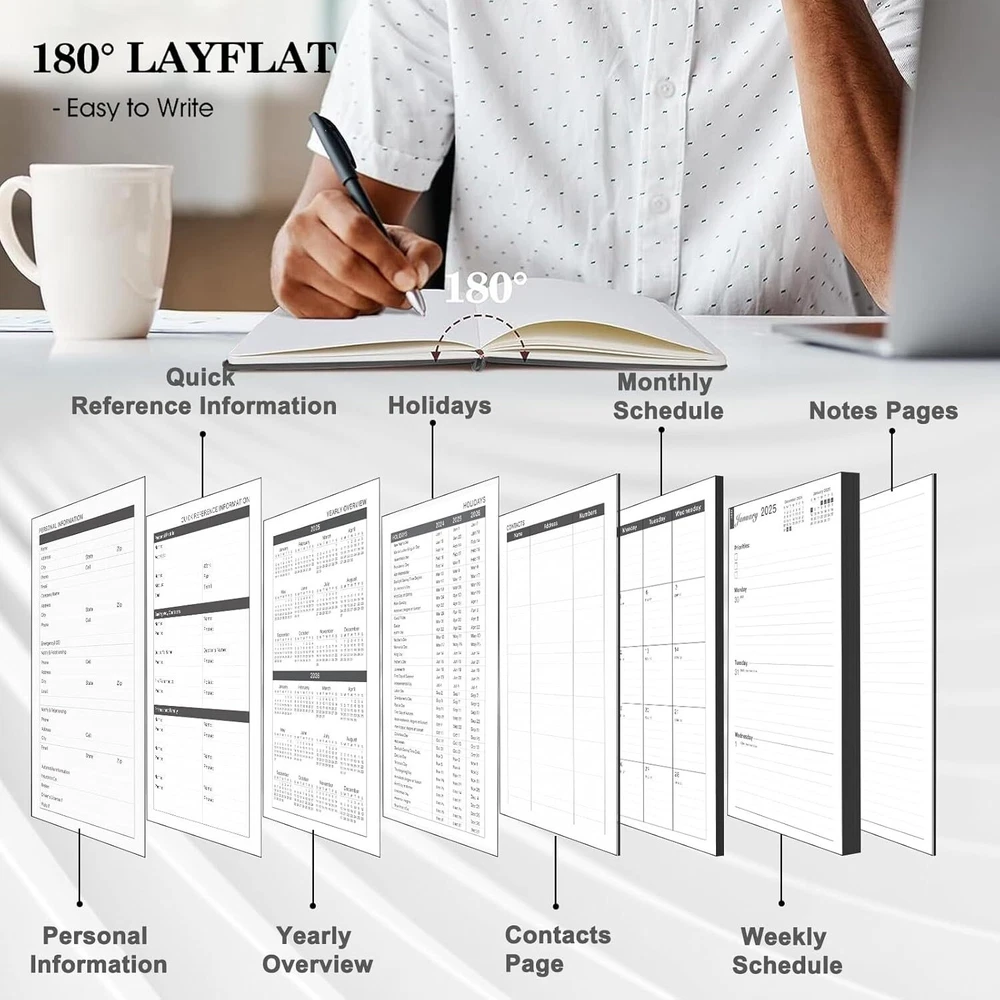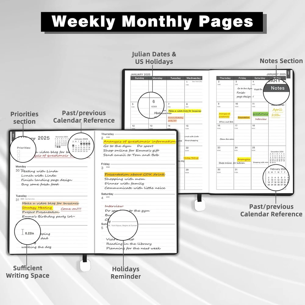 2025 Planner, Weekly Monthly Planner 2025, 8.25"×5.85", 12 Months, Black Product Details Brand: Ymumuda Color: Black Cover Material: Faux Leather Year: 2025 Format: Notebook Calendar Type: Weekly Monthly Planner Target Audience: Kid, Adult, Student, Officer Sheet Size: 5.85 X 8.25 inches Material: Paper Pages: 144 Pages 【 YMUMUDA 2025 PLANNER 】This planner 2025 hardcover (8.25"×5.85") features 12 months from JAN. 2025 to DEC. 2025 with weekly monthly planning pages, the planner offers other additional pages to help you well organized for the academic year and increase productivity. 【 MONTHLY PLANNING 】Each monthly pages with lined daily blocks lists major US holidays and Julian dates, the calendar planner 2025 also contains a notes section and past/previous calendar reference for your better past reviewing and future planning. 【WEEKLY PLANNING】Weekly view pages contain enough ruled space for your detailed daily planning, appointments, activities and so on. Major Holidays Listed, elapsed and remaining days noted. Priorities section is designed to focus your energy on your most important goals. 【PROFESSIONAL DESIGN 】Planner Special Soft Cover | Safty Round Corner Design | Professional Tight Binding Metal | Ribbon Bookmark | Yearly Overview | Contacts | Quick Reference Information | Monthly Printed Tabs | Holidays | Weekly and Monthly Pages . 5 colors(Black/ Blue/ Brown/ Red/ Green) available for you to choose.