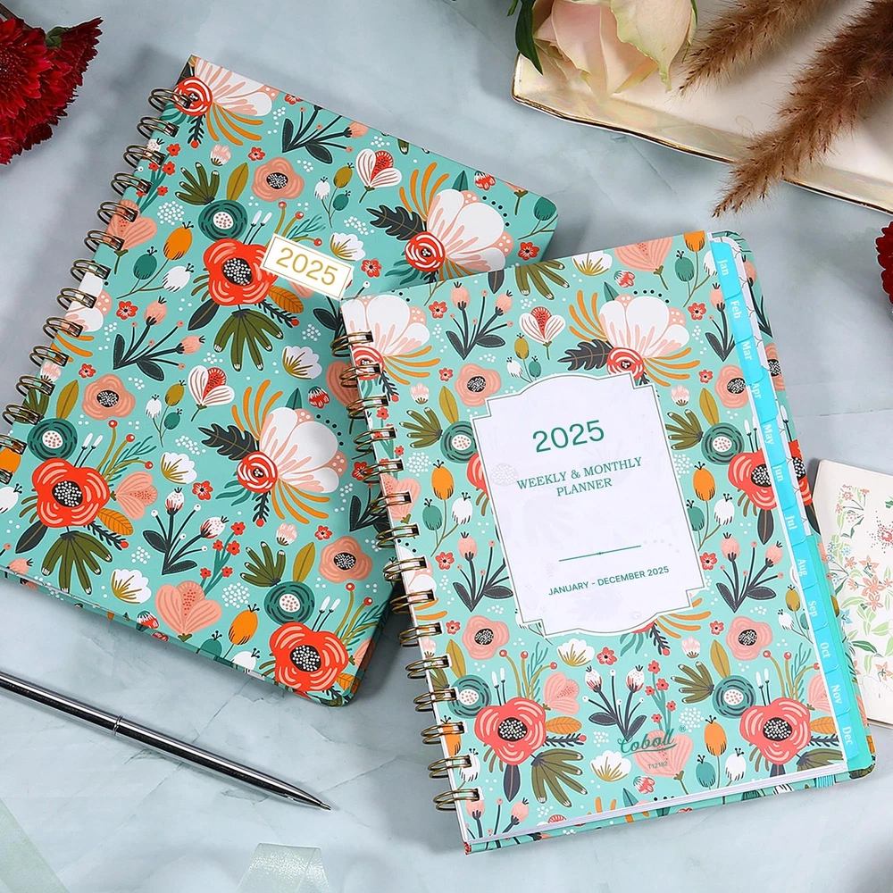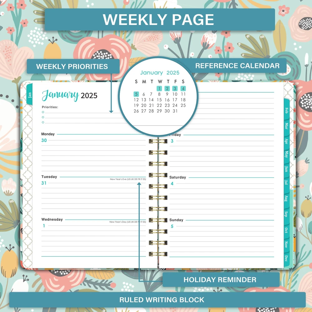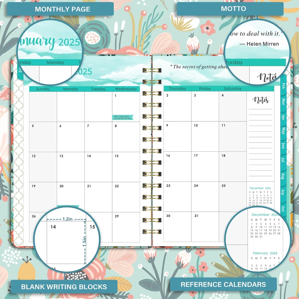 🌿2025 Planner - Calendar Planner 2025 with 12 months from January 2025 to December 2025, 6.4" x 8.5" Weekly & Monthly Planner with Tabs that help you plan your day easier. 🌿Yearly Overview - 2025 planner with monthly overview of 2025 and 2026, also features with quick reference information page, contact page and holidays page. 🌿Monthly Planning – Each monthly page contains a monthly overview with blank daily blocks in 1.25 x 1.1 in, previous and next month reference calendar for long-term planning, and a note section for priorities. 🌿Functional Design - Strong twin-wire binding for the 2025 planner lay-flat 360°+ 12 monthly tabs for quick reference +The back inside pocket for holding some cards + Elastic closure for keeping planner closed. 🌿Featured Organization - Hardcover design + Water resistant cover + Quick Reference Information + Yearly Overview of 2025 & 2026 + Holidays of 2025-2027