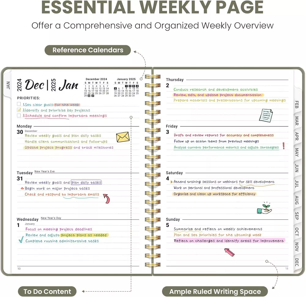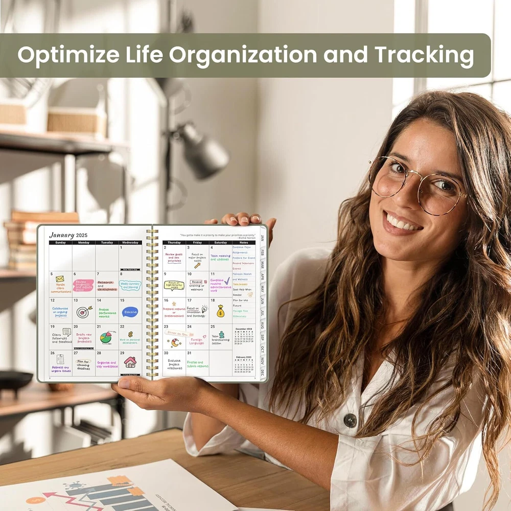 2025 Planner, Weekly and Monthly Calendar January 2025 - A.Green Start 2025 with Purpose : Embrace the new year with confidence using our ZOTIA 2025 Planner! Designed to cover January through December, this planner perfectly balances monthly and weekly layouts. At a convenient 6.3" x 8.5", it’s the ideal companion for tracking work goals, appointments, and daily priorities with precision and purpose. Effortless Monthly Planning : Stay organized and ahead of the curve with spacious daily blocks and holiday reminders on each monthly spread. Access past and future reference calendars, ensuring you have all the tools for seamless long-term planning right at your fingertips. Streamlined Weekly Organization : Achieve your weekly goals with ease! Each weekly page offers ample lined space for appointments, events, and to-do lists, complete with checkboxes to keep you on track. Celebrate your achievements as you navigate through the week.