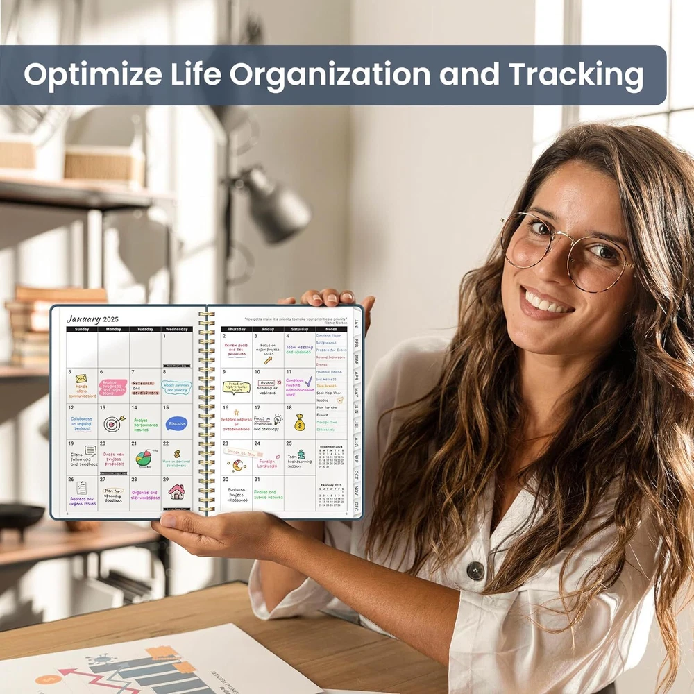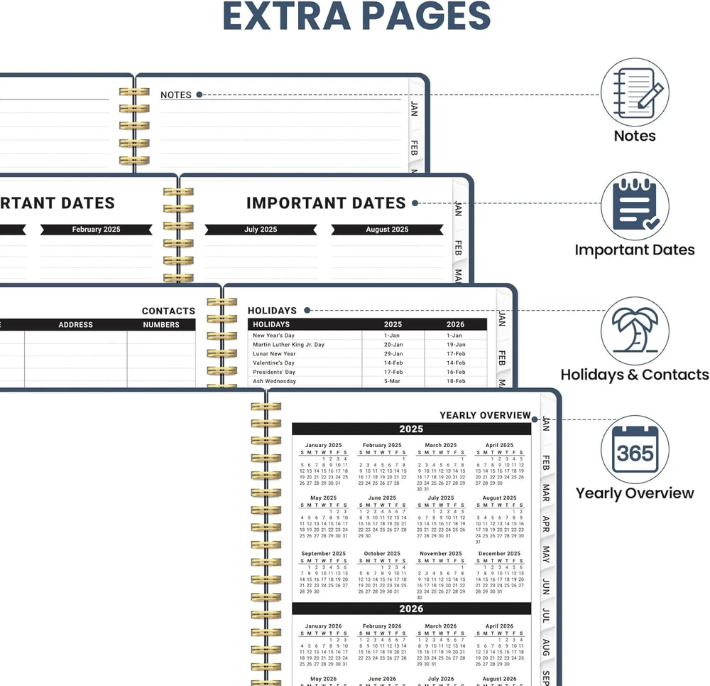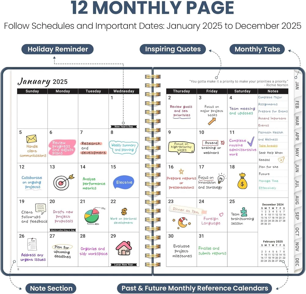 2025 Planner Weekly and Monthly, Jan 2025 - Dec 2025, Hardcover 2025 C.Navy Product Details Manufacturer: ZOTIA Brand: ZOTIA Item Weight: 11.7 ounces Product Dimensions: 8.27 x 5.71 x 0.69 inches Color: C.Navy Cover Material: Paper Material Type: Paper Ruling: Plain Sheet Size: A5 Inches Manufacturer Part Number: Z013-2025-A5-Navy Brand: ZOTIA Color: C.Navy Cover Material: Paper Year: 2025 Format: Notebook, Organizer Calendar Type: Weekly & Monthly Target Audience: Teacher, Adult, Student, Teen Sheet Size: A5 Inches Material: Paper Item Weight: 0.73 Pounds Start 2025 with Purpose: Embrace the new year with confidence using our ZOTIA 2025 Planner! Designed to cover January through December, this planner perfectly balances monthly and weekly layouts. At a convenient 6.3" x 8.5", it’s the ideal companion for tracking work goals, appointments, and daily priorities with precision and purpose. Effortless Monthly Planning: Stay organized and ahead of the curve with spacious daily blocks and holiday reminders on each monthly spread. Access past and future reference calendars, ensuring you have all the tools for seamless long-term planning right at your fingertips. Streamlined Weekly Organization: Achieve your weekly goals with ease! Each weekly page offers ample lined space for appointments, events, and to-do lists, complete with checkboxes to keep you on track. Celebrate your achievements as you navigate through the week! Stylish and Functional Design: The ZOTIA 2025 Planner combines thick, high-quality paper with a durable hardcover, designed to fit your lifestyle. Monthly tabs, twin-wire binding, and an elastic band for secure closure add practicality while maintaining a sleek, modern aesthetic. Elevate Your Productivity: Take charge of your time and unlock your full potential! Capture daily tasks, notes, big ideas, and important meetings all in one place. Ready to transform your ambitions into reality? Grab your ZOTIA 2025 Planner today and make this your most productive year yet!