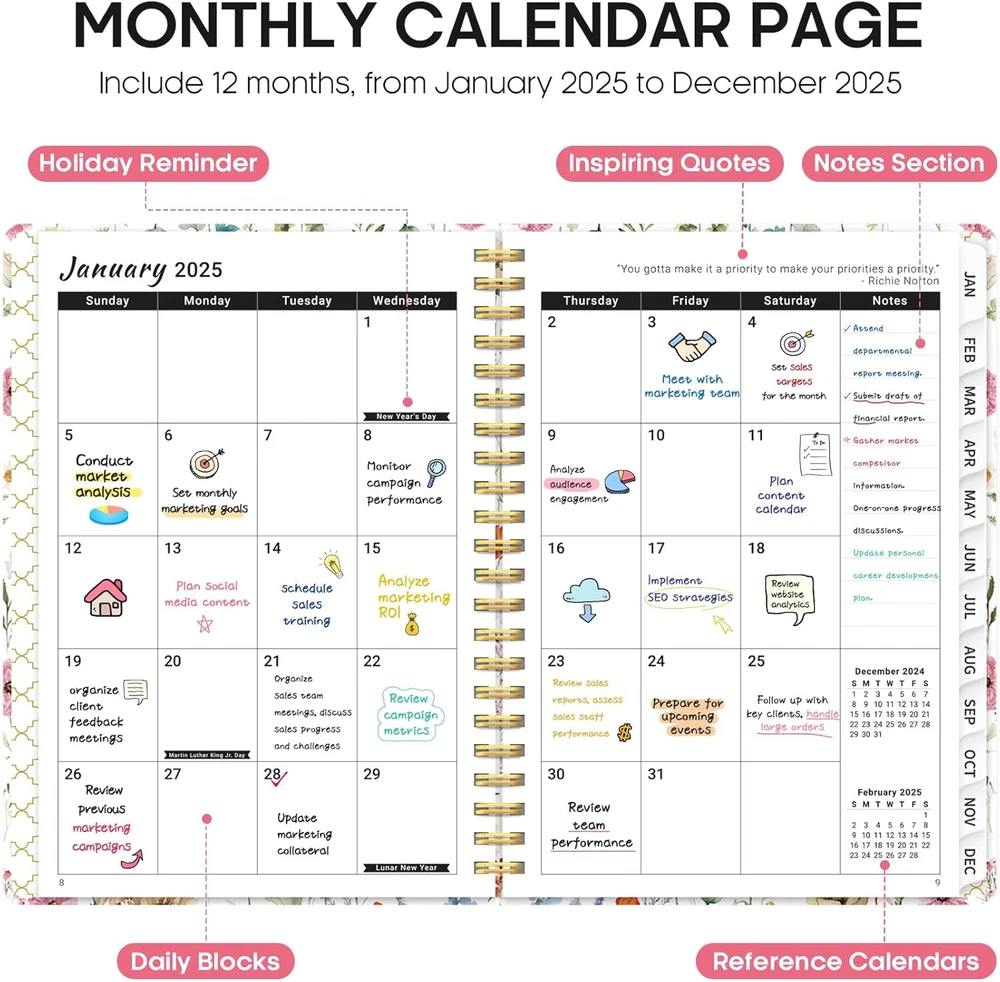 Store New Arrivals Add to Favorite View Feedback Contact Fast deliveries to the customer's home Quality customer service John Make the customers happy! 2025 Planner Weekly and Monthly, Jan 2025 to Dec 2025, Hardcover 2025 Calendar Planner Book with Tabs & Inner Pocket, Office Home School Supplies for Women & Men - A5 (6.3" X 8.5"), Spiral Bound, Wildflower Description Kickstart Your 2025 Journey: Get ready to conquer 2025 with our expertly crafted planner! Covering January to December 2025, this 6.3" x 8.5" planner strikes the perfect balance between monthly and weekly pages, making it easy to manage your work goals, appointments, and daily priorities with precisio. Effortless Monthly Management: Stay organized and ahead of the game with spacious daily blocks and holiday reminders on every monthly spread. With reference calendars for past and future months, you'll have everything you need for smooth long-term planning. Master Your Weekly Goals: Tackle your weekly objectives with ease! Each weekly page provides ample lined space for appointments, events, and to-do lists. Checkboxes make it easy to stay on track and celebrate each achievement as you progress through the week. Sleek and Functional Design: The Taja 2025 weekly and monthly planner features thick, high-quality paper and a durable hardcover that adapts to your lifestyle. With monthly tabs, twin-wire binding, and an elastic band for added convenience, this planner perfectly blends practicality with sleek design. Your Blueprint for Success: Take control of your time and unlock your full potential! Capture everything from daily tasks and notes to big ideas and important meetings. Ready to turn your dreams into reality? Order your 2025 planner today and make this year your most productive yet. Product Description Inner Pocket Safeguard Your Essential Notes and Cards in the Back Pocket of Your Planner Monthly Tabs Features 12 monthly two-sided tabs for quick checking Elastic Band The Elastic Band helps keep the inside of the planner neat, preventing pages from curling or getting damaged Twin-wire Binding Twin-Wire Binding for 180° Lay-Flat Convenience: Keep It Open on Your Desk with Ease Taja's Pens & Planners & Project Folders & Sticky Notes Add to Cart Add to Cart Add to Cart Add to Cart Add to Cart Add to Cart Add to Cart Customer Reviews 4.6 out of 5 stars 30 4.9 out of 5 stars 27 4.6 out of 5 stars 86 4.5 out of 5 stars 108 4.6 out of 5 stars 155 4.8 out of 5 stars 6 4.8 out of 5 stars 87 Price $5.99 $ 5 . 99 $8.99 $ 8 . 99 $6.99 $ 6 . 99 $5.99 $ 5 . 99 $7.99 $ 7 . 99 $6.99 $ 6 . 99 $9.99 $ 9 . 99 Size 5.7" x 8.6" A5 or B5 7" x 10" 6.5" x 3.5" 8.3" x11.7" 14.7" x 11.5" 5.3" x 8.2" Feature Hardcover Hard Cover Spiral Binding Staple Bound Staple Bound Spiral Binding Hardcover Color Multicolor Multicolor Multicolor Forest/Purple/Navy Abstract Floral Festive Pattern Multicolor Quantity 160 Pages / 80 Sheets 240 Pages / 120 Sheets 74 Pages / 37 Sheets 64 Pages / 32 Sheets 18 Months 18 Months 182 Pages / 91 Sheets Usage Scenario Office School & Home Supplies Office & Home & School Office School & Home Supplies Office School & Home Supplies Home & Office Supplies Home & Office Supplies Office School & Home Supplies Sheet Size A5 (6.3 x 8.5 inches) Calendar Type Weekly & Monthly Additional Features Hard Cover Paper Size A5 (6.3 x 8.5 inches) Color A-Wildflower Binding Spiral-bound Cover Material Paper Material Paper Material Type Paper Style A-Wildflower Pages 120 Pages Item Weight 0.73 Pounds Target Audience Officer, Teacher, Adult, Student Year 2025 Recommended Uses For Product Planning and organizing activities, tasks, and appointments Model Year 2025 ABOUT US We offer the best prices around on high quality products. Our E-store includes media such as books, movies, music and games while offering electronics, toys, sporting apparel, clothing, tools, general home, garden items and more. SHIPPING We are always working hard to ensure your package arrives as soon as possible. Please understand that some factors like weather, high postal traffic, and the performance of shipping companies are outside of our control. We offer free shipping to the lower 48 states and ship within 2 business days of payment, usually sooner. We do not accept P.O. Boxes. Please provide a physical address. For shipping outside of the continental USA, we only use eBay's Global Shipping Program. The item is shipped to KY and then sent to the rest of the world. International customers are responsible for all duties and taxes. Continue to 'check out' to calculate costs for shipping the item to your country. Messages regarding eBay's Global Shipping Program MUST be directed at eBay EXCLUSIVELY. RETURNS We offer a 30-Day Return Policy on items in which you are not completely satisfied with. You have the option of a full-refund or an exchange of the item. No returns are available on items shipped outside of the USA PAYMENT We accept PayPal. CONTACT US This page content is yet to come Please ad us to your favorite seller and visit again later Thank You CUSTOMER SATISFACTION We try our very best to make sure every customer is completely satisfied. If there's a problem, message us! We're happy to help. WE ACCEPT