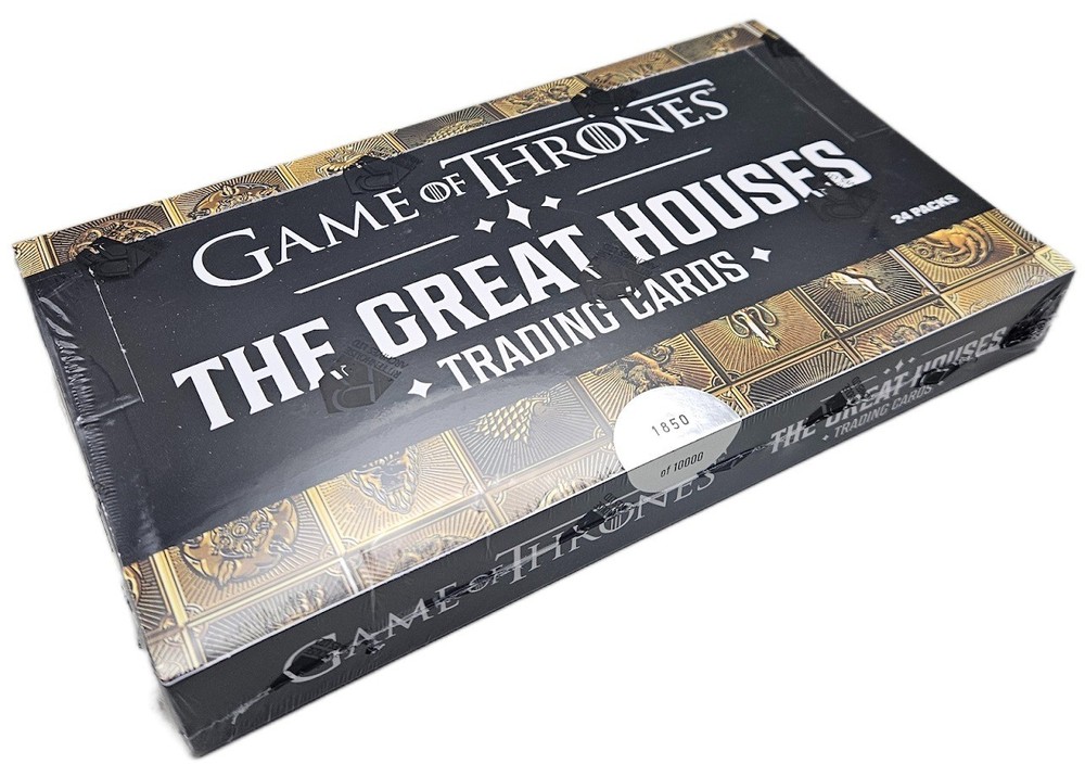 2025 Rittenhouse Game Of Thrones The Great Houses - Sealed Hobby Box 24 Packs Per Box - 5 Cards Per Pack 2 Autographs and 2 Wardrobe Cards Per Box Game of Thrones The Great Houses includes a 61 Card Base Set featuring the characters from all of the major houses in Game Of Thrones! Find 1 Pedro Pascal or Kit Harington or Emilia Clarke or George R.R. Martin Autograph Card in every case! Search for Dual Autograph Cards, Relic Autograph Cards, Dragonglass Autograph Cards, Printing Plate Autograph Cards & Inscription Autograph Cards! Plus Randomly Inserted 5x7 Quad Signature Cards Signed by Kit Harington, Maisie Williams, Sophie Turner and Isaac Hempstead-Wright! Search for Randomly Inserted Quad Signature Cards featuring signatures of Sophie Turner, Kit Harington, Maisie Williams, and Isaac Hempstead Wright! Look for Rare One of A Kind Hand Drawn Sketch Cards and Dragonglass Acetate Character Inserts numbered to 15 each! 2 Autographs Cards 2 Wardrobe Cards Find One Pedro Pascal or Kit Harington or Emilia Clarke or George R.R. Martin Autograph in every case! Look for Dual Autograph Cards, Plus Relic Autograph Cards, Dragonglass Autograph Cards, Printing Plate Autograph Cards and Inscription Autograph Cards! Plus Randomly Inserted 5x7 Quad Signature Cards Signed by Kit Harington, Maisie Williams, Sophie Turner and Isaac Hempstead-Wright! Look for Rare One of A Kind Hand Drawn Sketch Cards and Dragonglass Acetate Character Inserts numbered to 15 each. Base: 61 Card Base Set Featuring the Characters from All of the Major Houses in Game of Thrones! Autographs: George R.R. Martin (Co-Executive Producer) Pedro Pascal (Oberyn Martell) Emilia Clarke (Daenerys Targaryen) Kit Harington (Jon Snow) Peter Dinklage (Tyrion Lannister) Maisie Williams (Arya Stark) Ramin Djawadi (Composer) Charles Dance (Tywin Lannister) Lena Headey (Cersei Lannister) Natalie Dormer (Margaery Tyrell) Sophie Turner (Sansa Stark) Joe Dempsie (Gendry) Isaac Hempstead-Wright (Bran Stark) Aidan Gillen (Littlefinger) Julian Glover (Grand Maester Pycelle) Slavko Juraga (Silk King) Kristofer Hivju (Tormund Giantsbane) Jacob Anderson (Grey Worm) Keisha Castle-Hughes (Obara Sand) Jessica Henwick (Nymeria Sand) Sibel Kekilli (Shae) Hannah Waddingham (Septa Unella) Bonus Sets Include: Autograph Cards (1:12 Packs) Wardrobe Relic Cards (1:12 Packs) 67 Saga of Tyrion Lannister and 10 Saga of Catelyn Stark Cards (1:3 Packs) 24 Dragonglass Acetate Character Cards (#’d to 15 each) 18 Artifex Metal Cards Featuring the Art of David Desbois (#’ed to 25 each) 14 Nights Watch Cards 9 Free Folk Cards 5 Kingsguard Cards 10 Dothraki Cards 10 JJ Lendl Episode Poster Cards (#’d to 75 each) 10 Artist-Signed JJ Lendl Episode Poster Cards (#’d to 25 each) Hand-Drawn Sketch Cards by renowned artists, including Mick & Matt Glebe, Charles Hall, Warren Martineck, Gavin Hunt, Tirso Llaneta, Sean Pence, Jason Saldajeno, Tim Shay and many more!