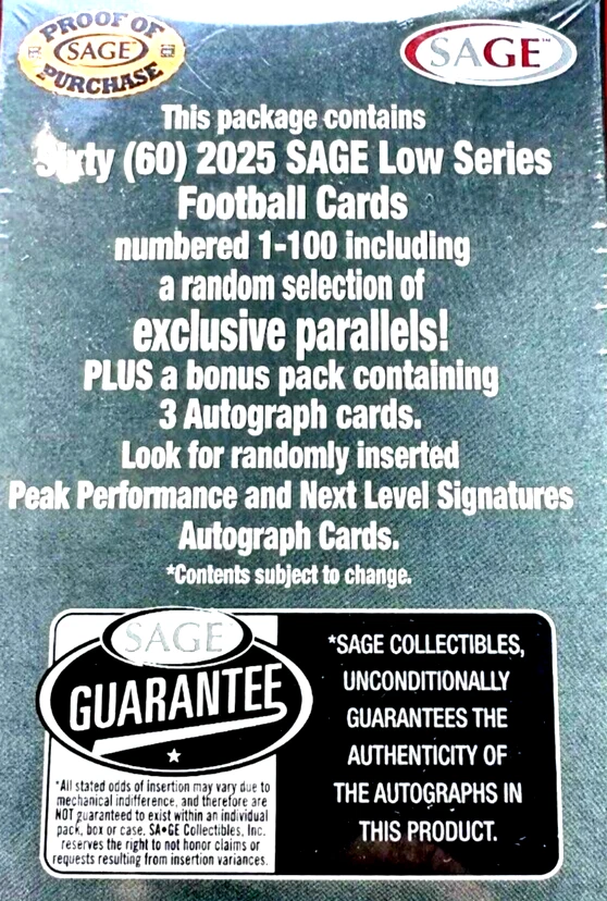 Qty. 1 - 2025 Sage Low Series Football Trading Cards - Blaster Box Features: Factory Sealed 60 cards per box Guaranteed 3 Autographs per box