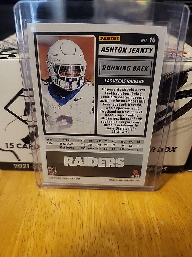 Card Condition:ExcellentCard Number:14Parallel/Variety:[Base]Features:Rookie, InsertLeague:National Collegiate Athletic Association (NCAA), National Football League (NFL)Sport:FootballSeason:2025Player/Athlete:Ashton JeantyType:Sports Trading CardTeam:Boise State Broncos, Las Vegas RaidersSet:2025 ScoreInsert Set:RookiesManufacturer:Panini