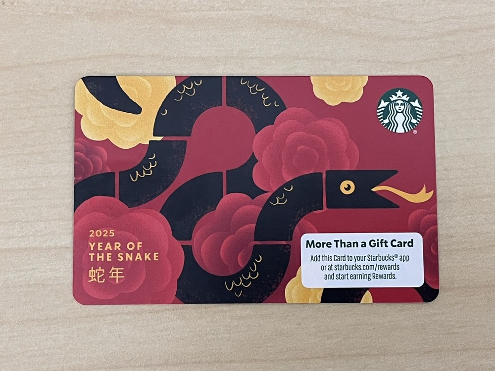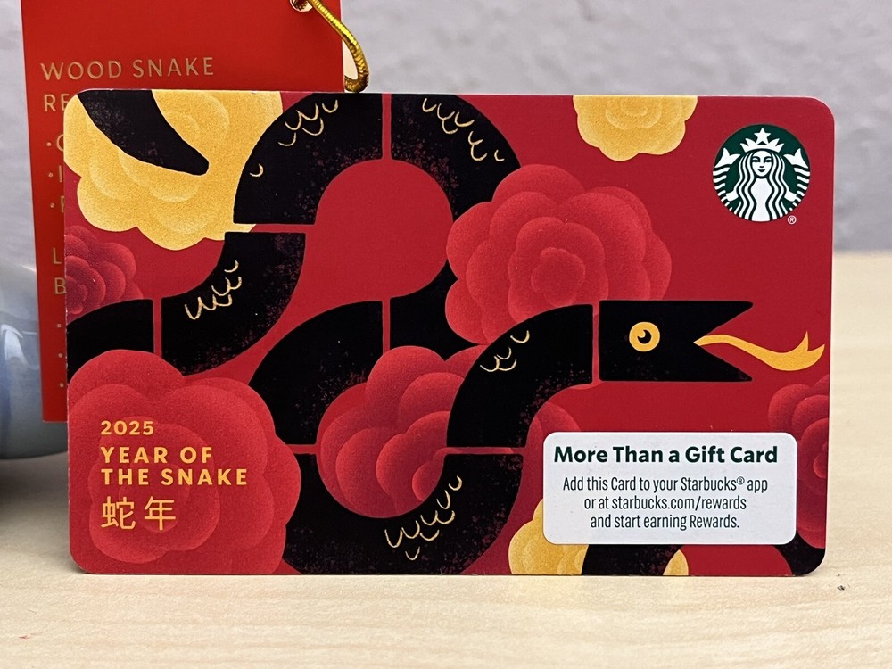- 2025 STARBUCKS LUNAR YEAR OF THE SNAKE GIFT CARD - NEW NO VALUE Magnetic Strip - BRAND NEW - SHIPS OUT IMMEDIATELY - REPUTABLE SELLER : CHECK MY FEEDBACK!!! LISTING IS FOR A SINGLE (1) GIFT CARD WITH ZERO (0$) BALANCE Please reference pictures for description From smoke free / pet free home YOU PICK THE SHIPPING OPTION. GROUND ADVANTAGE IS THE CHEAPEST IF YOU REQUIRE EXPEDITED SHIPPING OR EXTRA PACKAGING PLEASE SELECT ONE OF THE LISTED EXPEDITED SHIPPING SERVICES. THANK YOU!