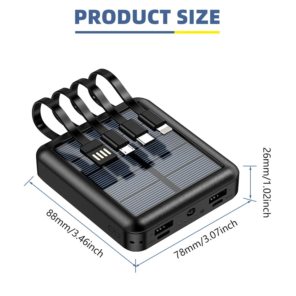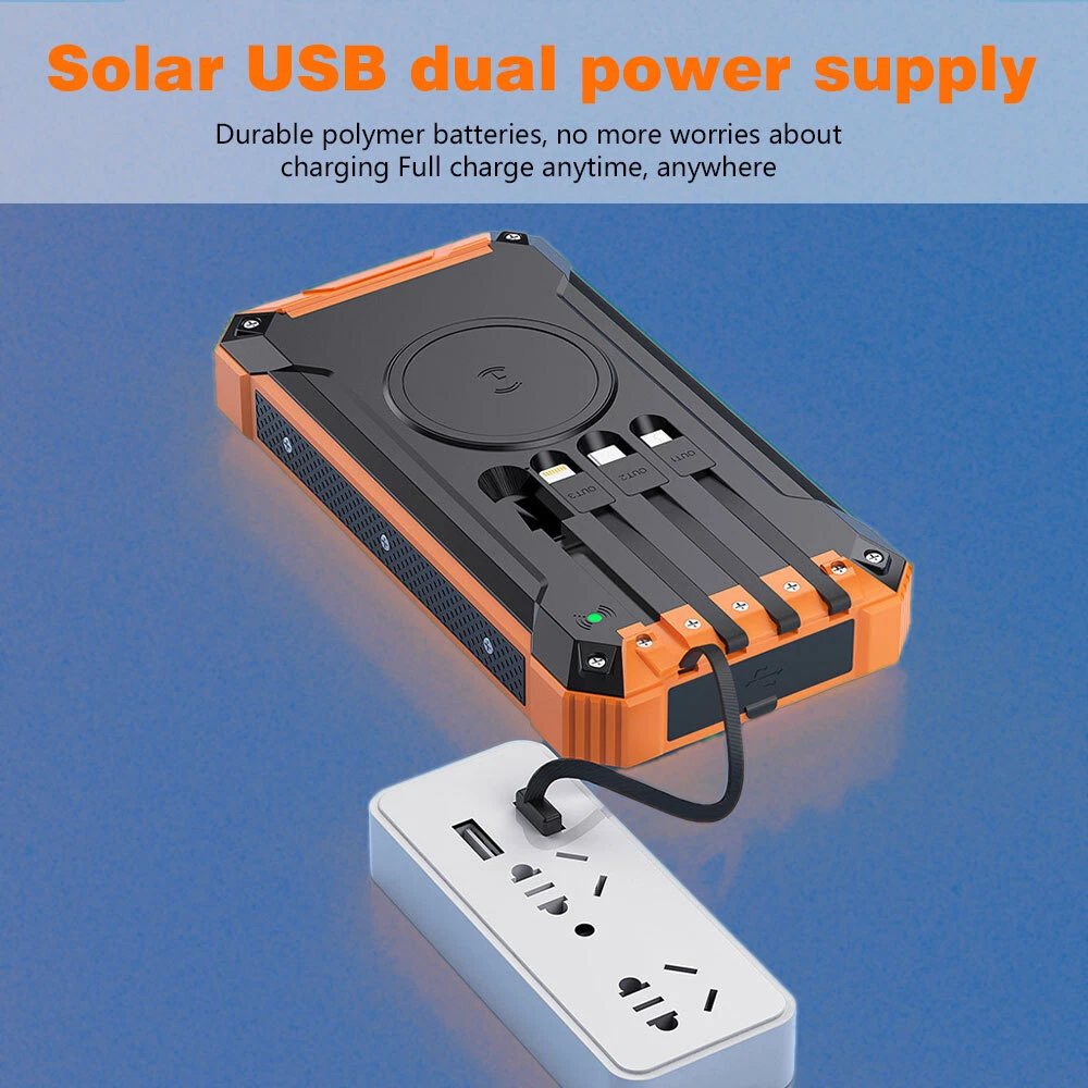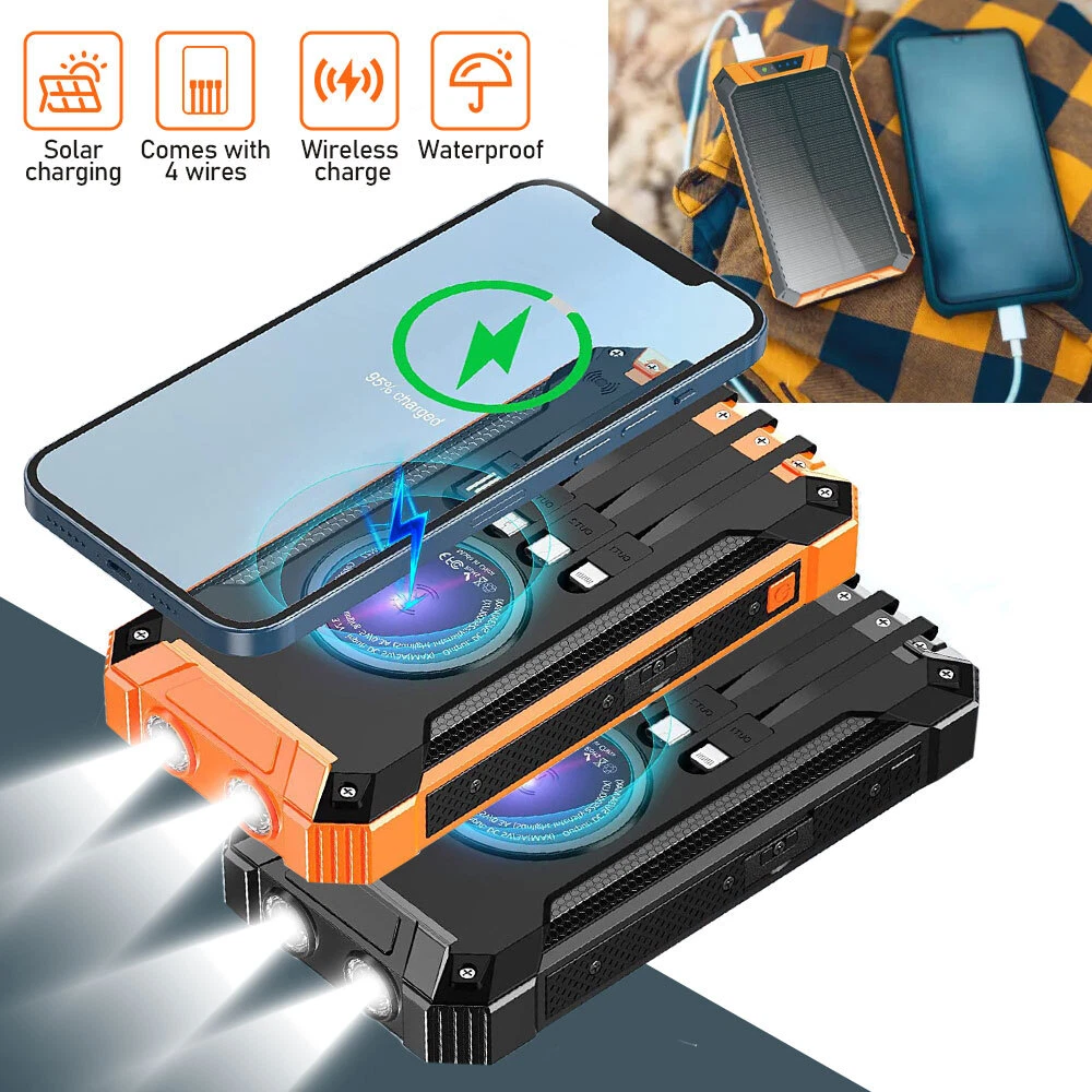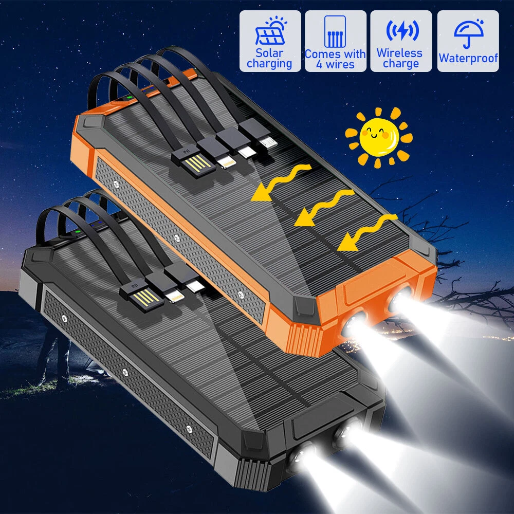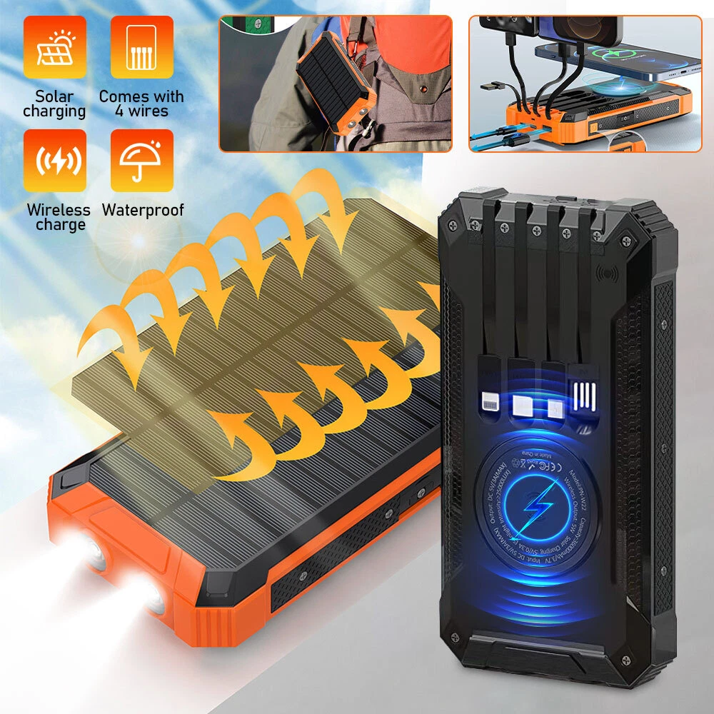 A: 36000mAh Wireless Sol ar Power Bank Featu re : [Built-in 4 Charging Cables] This power bank is built with 3 output cables ( Type C*1 & iOS*1 & Micro USB*1) and 1 USB-A input cable. No matter output or input, you don’t need to carry charging cables. Get rid of messy cables, charge at anytime and everywhere. [Advanced Wireless C harging] This portable charger supports advanced wireless charging, compatible with all wireless-enabled devices. Such as iPhone 14/13/12 series, Samsung Galaxy S23/S22/S21 series, etc. Put your device on the wireless charging area, it gets charged immediately. Come and enjoy your cable-free charging time. [Power 6 Devices at Once] This solar charger is also equipped with 4 ports (iOS input, USB A output, USB C input/output), providing 5V/3A high-speed charging to save time. Along with 4 charging cables and wireless charging, it supports charging 6 devices simultaneously. Keep all your devices alive. Sharing with families and friends is perfect. [Super Large Capacity] With 36000mAh premium Li-polymer battery, this solar power bank can charge your devices multiple times. It can be recharged via adapter and solar power, free your worries of poweroff. Equipped with smart protection IC chip, it guarantees charging safety intelligently. [Sturdy&Durable D esign for Outdoor] This solar battery pack is well made to be Waterproof/Shockproof/Dust-proof, which can withstand the harsh environment outdoors. It’s equipped with Dual super bright LED lights, a Must-Have tool for outdoor activities and home emergencies. Sp e cification : Product name: solar energy with charging cable Function: solar / wired / wireless charging treasure Type-C Output:DC 5V/3A 9V/2.2A 12V1.67A(Max) USB Output 1/2:DC 5V/4.5A 5V/3A 9V/2A 12V/1.5A (Max) Wireless Output:5W/7.5W/10W/15W(Full Compatible) Micro USB Input:DC 5V/2.4A 9V/2A(Max) Type-C Input:DC 5V/3A 9v/2.22A(Max) Size: 183*94*27mm Capacity:36000mAh Material: Plastic ABS+Silicone Battery: polymer battery Colour: orange,black Process: solar panel Applicable scenes: Night reading/camping/emergency/treasure hunting Pac kage list: 1x Solar Power Bank Wireless Charging ================================== B:20000mAh Mini Solar Power Bank (No Wireless Function) Features: [Very convenient] The mobile power bank has an iphone / micro / Type-C charging cable, so there is no need to carry the charging cable with you. The compatibility is excellent, and the mobile power bank can charge all common devices. This is one of the smallest and lightest portable chargers. Higher capacity but lighter, more portable, smaller in size and easier to carry. This is an excellent power bank that is essential when traveling. [High-speed charging and long-lasting battery] 2.1A fast charging, 50% faster than before, providing high-speed charging for your device. Smart chips can reduce energy consumption and increase power conversion rates. High-density and large-capacity lithium-ion batteries provide ultra-high power capacity and strong cycle life. [4 of 1 output port] The portable charger with built-in cable, built-in mini-cable type C cable and Iphone cable is a total of 3 cables and 2 USB output port directly used for all mobile phones. Charging 3 devices at the same time, the output current can reach 2.1A (maximum); the input current is 2A, and the fast charging power supply with a 2A adapter is compatible with 99% of mobile phones. [Ultra-thin design] portable charger, a portable charger that never gets dirty. Only 10mm; ultra-thin mobile power; carry it with you. Portable phone charger with built-in cable. [Your safety, our con cern] The built-in UL certified battery can ensure your safety. Using lithium polymer batteries is twice as safe as lithium ion battery pack chargers. Portable charger with built-in cable. Specifications: Capacity: 20000mAh Input: 5V / 2A (maximum) Output: 5V / 2.1A Weight: 260 grams Battery: Lithium polymer Charging time: 8-10h Packing Included: 1 x Power Bank 1 x User Manual Kindly note: 1. In order to fully activate the battery, please charge it via outlet or computer for 10 hours at least at the first 2-3 uses. 2. Fully charging by outlet takes approximately 10 hours. Do not charge it all day nor over voltage. 3. For safety, DO NOT leave the power bank charging in car in case of high temperature and avoid crashing. Do not make charge while charging itself. 4. To turn on/off the LED light, pleas long press the power button. 5.The energy transformation from solar to electricity is rather slow , Fully charger need 10 days via solar, In daily life, we highly recommend charge it via wall outlet. 6. 20000 mah is a theoretical capacity from the company.You can charge your phone 1-3 times(depending on your phones conversion rate) 7.Solar panel is just a special design,please charge it via socket