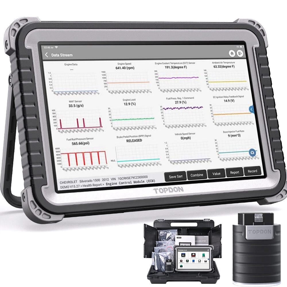 2025 TOPDON Phoenix Plus V V+ELITE Bidirectional Diagnostic Scanner ECU Coding NEWEST TOPDON Phoenix Plus 10 inch Professional Auto Diagnostic Tool TOPDON Phoenix Plus = 10-inch HD IPS Touch Screen+ Car full system Scanner +Bluetooth/Wifi +41 Special service+ADAS Calibration + Active test+ E*CU coding+ Android 10 OS + 64GB Memory +Quad-Core 2.0GHz processor+ 2 Years free update online Why choose TOPDON Phoenix Plus 1.Powerful Quad-Core 2.0GHz processor with 4G+64G Hardware Configuration 2.OE-Level Wireless Intelligent Diagnostics, covering more than 100 car makes 3.Unique Modular Design, supporting up to 8 functional modules for any application scenarios 4.Android 10 OS running on 10-inch HD IPS Touch Screen 5.Supporting 41 Service Reset Functions, more to cover soon 6.Topological Graph 7.Supporting ADAS Calibration 8.Remote Technical Support via TeamViewer The Advanced Functions of TOPDON Phoenix Plus Supports : 1.ADAS calibration Advanced Driver Assistance System (ADAS) is an electronic component in a vehicle, including various safety functions of the vehicle, such as automatic emergency braking (AEB), lane departure warning (LDW),lane keeping assist, blind spot elimination, night vision camera and Adaptive lighting. The function on the equipment is disabled by default, and the user needs to activate the function with an activation card before using it. And this function needs to be matched withTOPDON ADAS calibration tools. Mainly used to calibrate various camera and radar of driver assistance systems 2 .41 Special functions : TOPDON Phoenix Plus supports matching, coding, programming of most vehicles' programable modules,and most commonly used maintenance and reset functions, namely, Oil Reset, Elec. Throttle Adaption,IMMO Service,Injector Coding,Break-pad Reset, Steering Angle Reset, ABS Bleeding,AFS Reset,Battery Matching,A/T Learning, DPF Regeneration, EGR Adaption, TPMS Reset, Sunroof lnitialization,Suspension Matching, Gear Learning, SRS Reset, ODO Reset, AdBlue Reset, A/F Reset,CoolantBleeding, Language Change, NOx Sensor Reset, Seat Calibration, Stop/Start Reset,Transport Mode,Tyre Reset, Windows Calibration. 3.12 Data Graphs shows in the Same Screen It is better you can compare and Analysis the Data , easy to find the problem of the car ! 4. Actuation Test: This function is used to test whether the execution components in the electronic control system can work 5.E*CU CODING: The Coding function is used to re-flash the vehicle control modules, it allows you to reprogram adaptive data for certain components after making repairs or replacements. TOPDON Phoenix Plus has 41+ service functions which allows you to reset various systems in your vehicle. support more function than other scanners priced similarly : 1.Oil Reset The lightening of the car maintenance light indicates that the vehicle needs maintenance.Reset them ileage or driving time to zero after the maintenance, so the maintenance light will go out and the system will start a new maintenance cycle. 2.Elec.Throttle Adaption Elec. Throttle Adaption is to utilize the car decoder to initialize the throttle actuator so that the learning value of the E*CU returns to the initial state.By doing these, the movement of the throttle (or idle motor)can be more accurately controlled, thus adjust the intake volume. 3.Steering Angle Reset To reset the steering angle, first find the relative zero point position for the car to drive in straight line.Taking this position as reference, the E*CU can calculate the accurate angle for left and right steering.After replacing the steering angle position sensor, replacing steering mechanical parts (such as steering gearbox, steering column, end tie rod, steering knuckle), performing four-wheel alignment, or recovering car body, you must reset the steering angle. 4.Battery Matching This function enables you to perform a resetting operation on the monitoring unit of vehicle battery, in which the original low battery fault information will be cleared and battery matching will be done. 5.ABS Bleeding When the ABS contains air, the ABS bleeding function must be performed to bleed the brake system to restore ABS brake sensitivity. lf the ABS computer,ABS pump, brake master cylinder, brake cylinder, brake line, or brake fluid is replaced, the ABS bleeding function must be performed to bleed the ABS. 6.Break-pad Reset lf the brake pad wears the brake pad sense line, the brake pad sense line sends a signal sense line to the on-board computer to replace the brake pad.After replacing the brake pad, you must reset the brake pad.Otherwise, the car alarms. 7.DPF Regeneration DPF regeneration is used to clear PM (Particulate Matter) from the DPF filter through continuous combustion oxidation mode (such as high temperature heating combustion, fuel additive or catalyst reduce PM ignition combustion) to stabilize the filter performance. 8.Gear Learning The crankshaft position sensor learns crankshaft gear machining tolerance and saves to the computer to more accurately diagnose engine misfires. lf gear learning is not performed for a car equipped with Delphi engine, the MlL turns on after the engine is started.The diagnostic device detects the DTC P1336'gear not learned'. In this case, you must use the diagnostic device to perform gear learning for the car.After gear learning is successful, the MIL turns off. After the engine E*CU, crankshaft position sensor, or crankshaft flywheel is replaced, or the DTC 'gear not learned" is present, gear learning must be performed. 9.IMMO Service To prevent the car being used by unauthorized keys, the anti-theft key matching function must be performed so that the immobilizer control system on the car identifies and authorizes remote control keys to normally use the car. When the ignition switch key, ignition switch, combined instrument panel,E*CU,BCM, or remote control battery is replaced, anti-theft key matching must be performed. 10.Injector Coding Write injector actual code