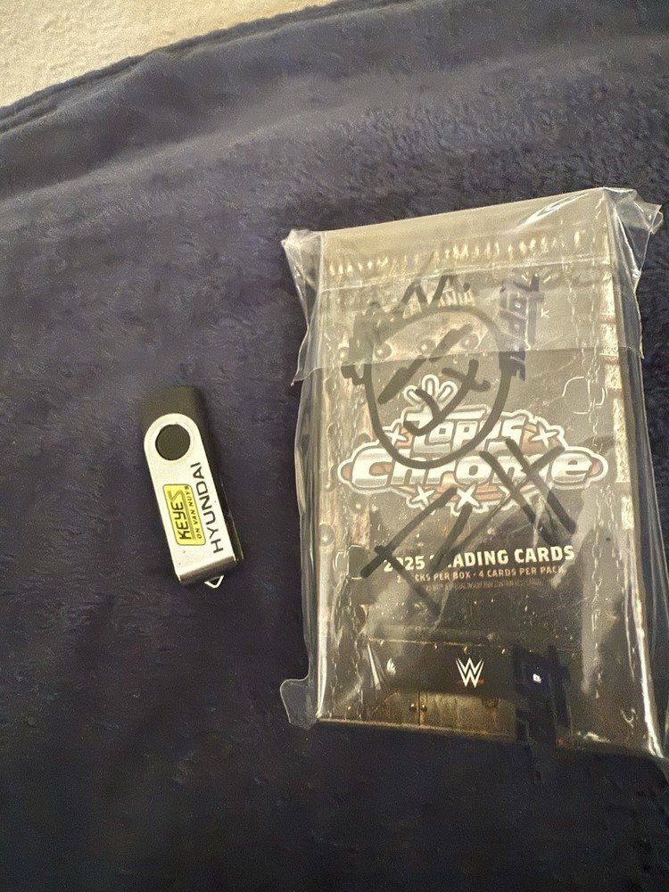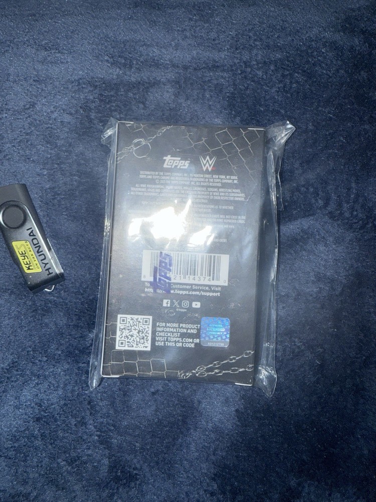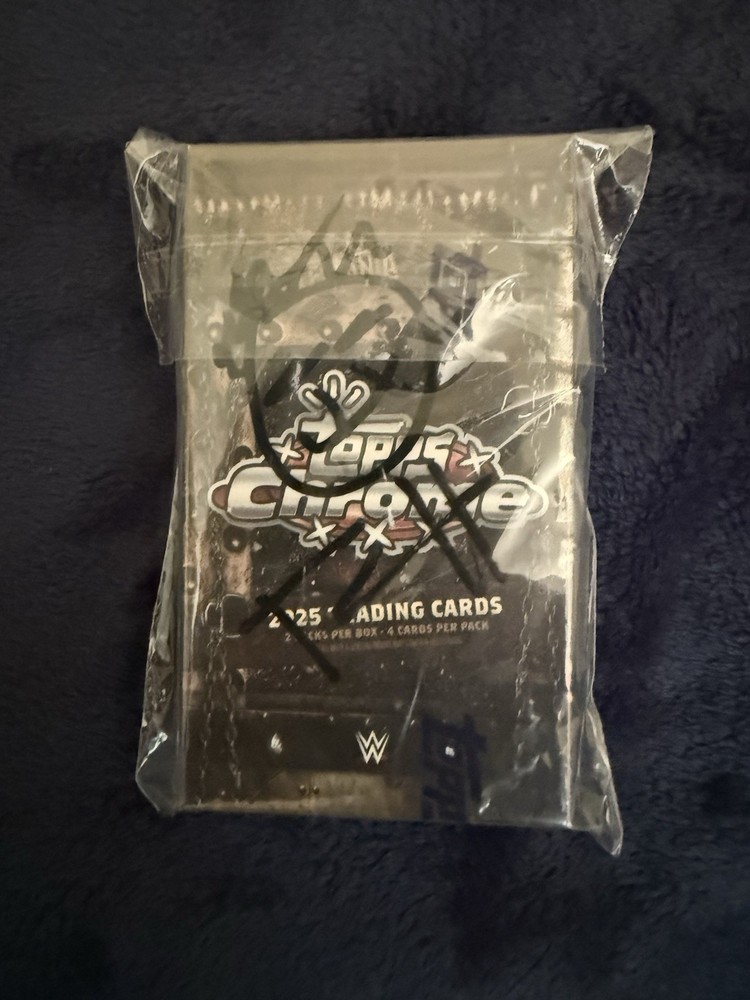 The product is a 2025 Topps WWE WrestleMania exclusive Cactus Jack box signed by Travis Scott. This limited edition sports trading card box features multi-player cards from the WWE wrestling league in a Chrome series configuration. As an original release by Topps, this modern era collectible is a must-have for fans and collectors of wrestling memorabilia. The exclusive features and signature make it a sought-after item for fans of both wrestling and trading cards.p