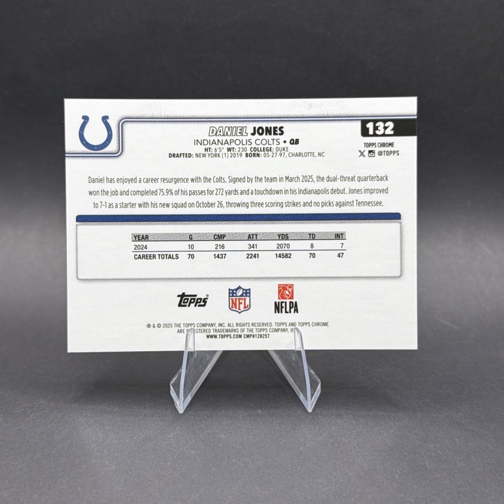 The product is a 2025 Topps Chrome trading card featuring Daniel Jones of the Indianapolis Colts. This specific card is a Frozen Fractor parallel with a print run of -2/0, making it a rare and highly sought-after collectible item.