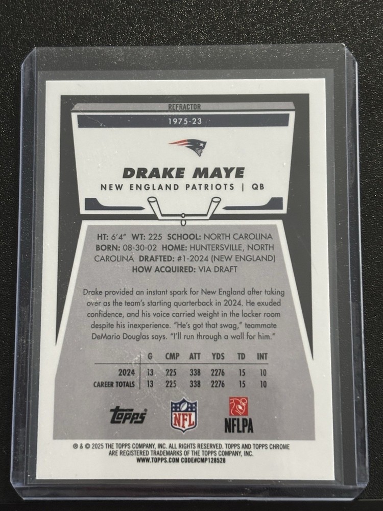 The 2025 Topps Chrome Drake Maye 1975 Throwback Refractor trading card is a standard-sized football card featuring the player Drake Maye from the New England Patriots. This card is part of the 2025 Topps Chrome set and is a throwback parallel/variety, with a 35 Pt. card thickness and made of card stock material. It is not autographed but is authenticated by Topps, making it an original licensed reprint for collectors and fans of the National Football League (NFL). Perfect for fans of football memorabilia and trading cards, this card captures a unique and nostalgic moment in sports history.
