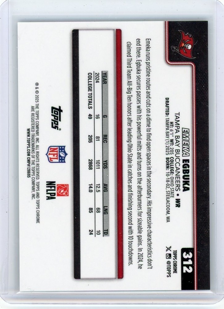 The product is a 2025 Topps Chrome Emeka Egbuka Rookie Orange Refractor trading card featuring the player Emeka Egbuka from the Tampa Bay Buccaneers in the National Football League (NFL). This rare card is numbered out of 25 and is part of the Topps Chrome set. It is a highly sought-after collectible for football fans and card enthusiasts looking to add a unique piece to their collection.