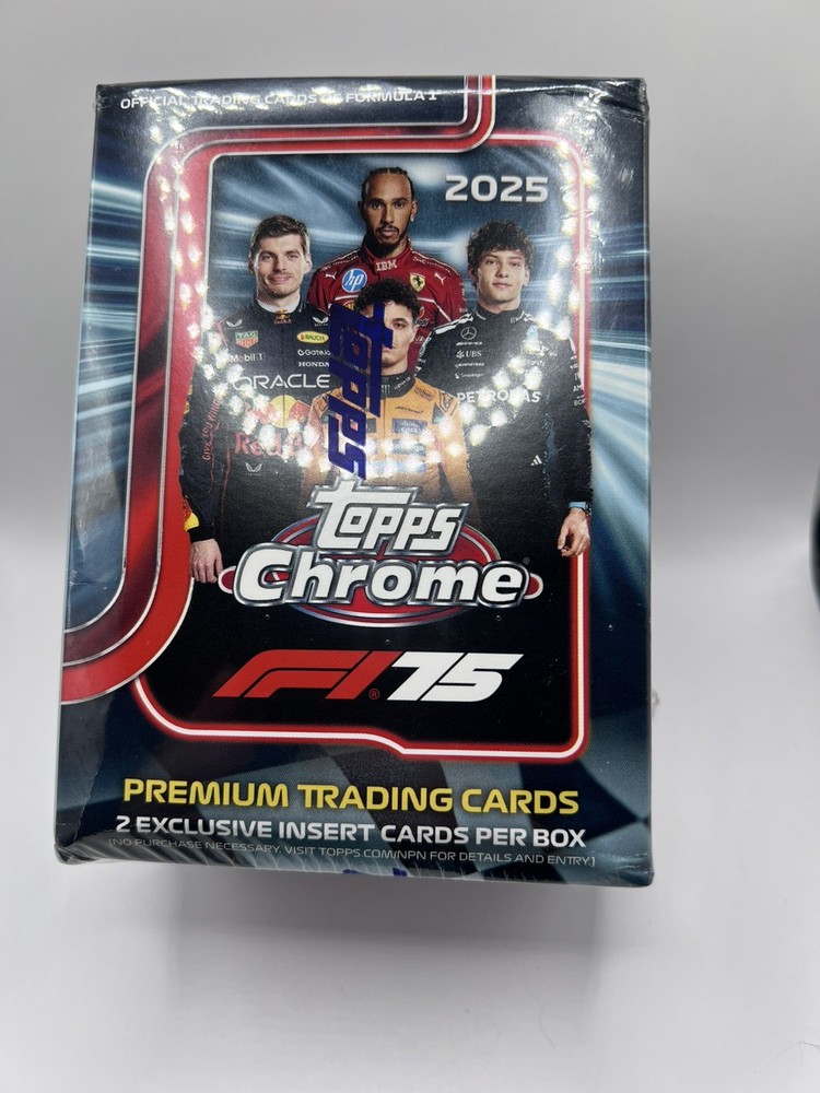 The 2025 Topps Chrome F1 Formula One Blaster Box is a sports trading card set featuring drivers from the Formula 1 league. Manufactured by Topps in the United States, this box contains standard-sized cards made of card stock. Each box may include autographed cards, although it is not guaranteed that each card will be autographed. The set includes various cards from the 2025 season of Formula 1, providing fans with a collection of auto racing memorabilia. This product is perfect for collectors looking to add to their sports trading card collection with cards from the fast-paced world of Formula 1.
