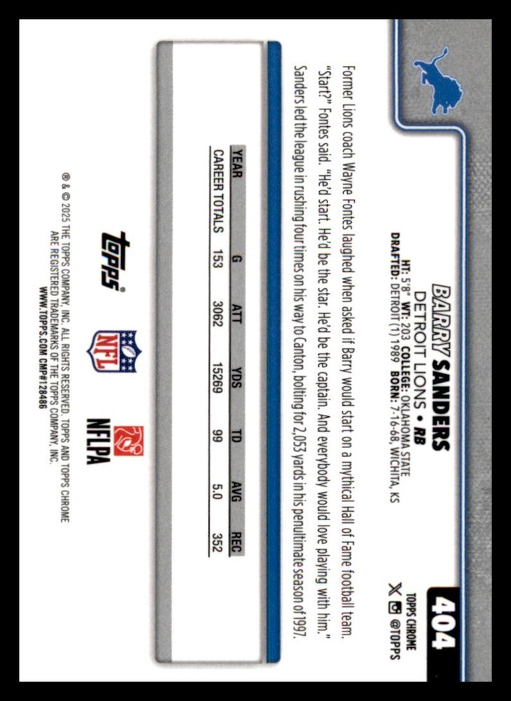 This is a nice example of a 2025 Topps Chrome Football #404 Barry Sanders Other important information about this card: Image Variation In 2025 Barry Sanders played for the Detroit Lions. Please check out our other listings for more great cards.