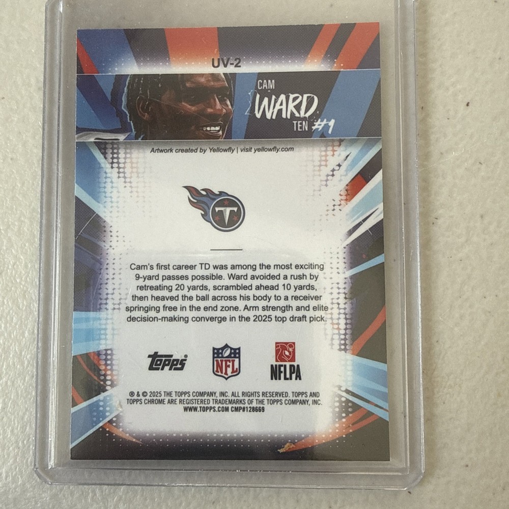 The 2025 Topps Chrome Football Cam Ward #UV-2 Ultra Violet Rookie RC SSP Case Hit is a highly sought after sports trading card featuring Cam Ward of the Tennessee Titans. Manufactured by Topps, this card is part of the 2026 Topps Chrome set and is a special Ultra Violet parallel variety. As an ungraded, standard-sized card, it is a valuable collector's item for football fans and trading card enthusiasts alike. This rookie card is a rare find and is sure to be a standout addition to any sports memorabilia collection.
