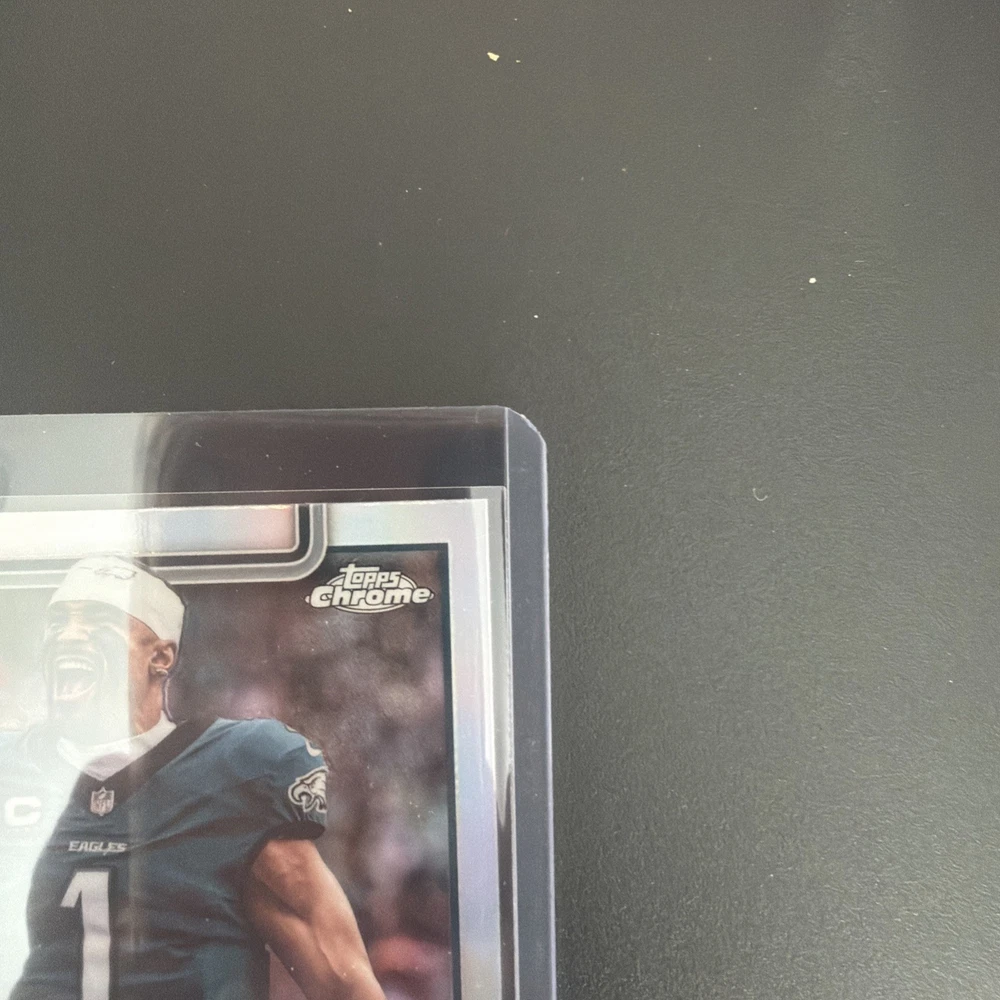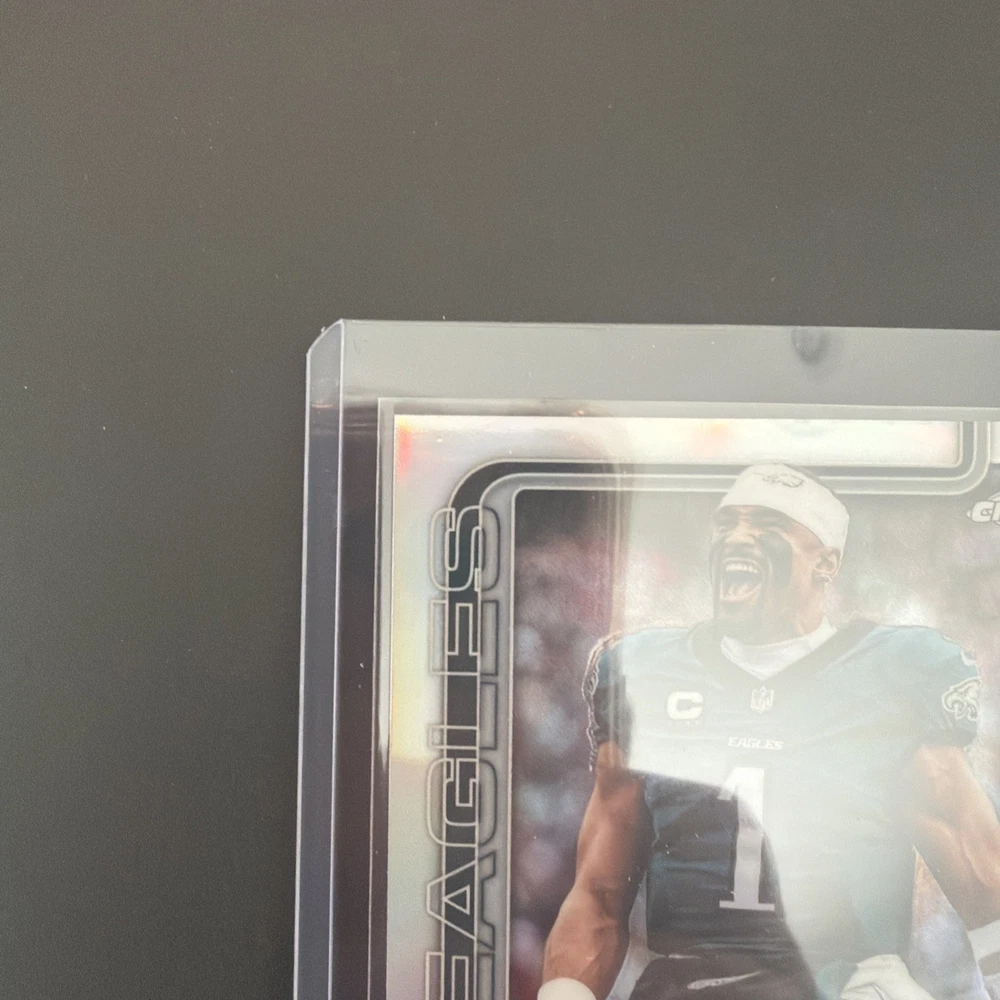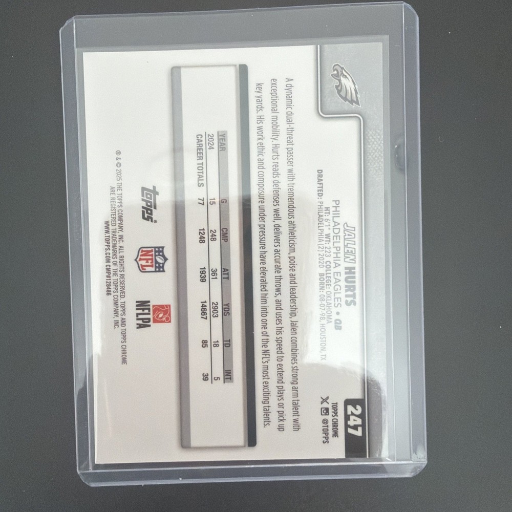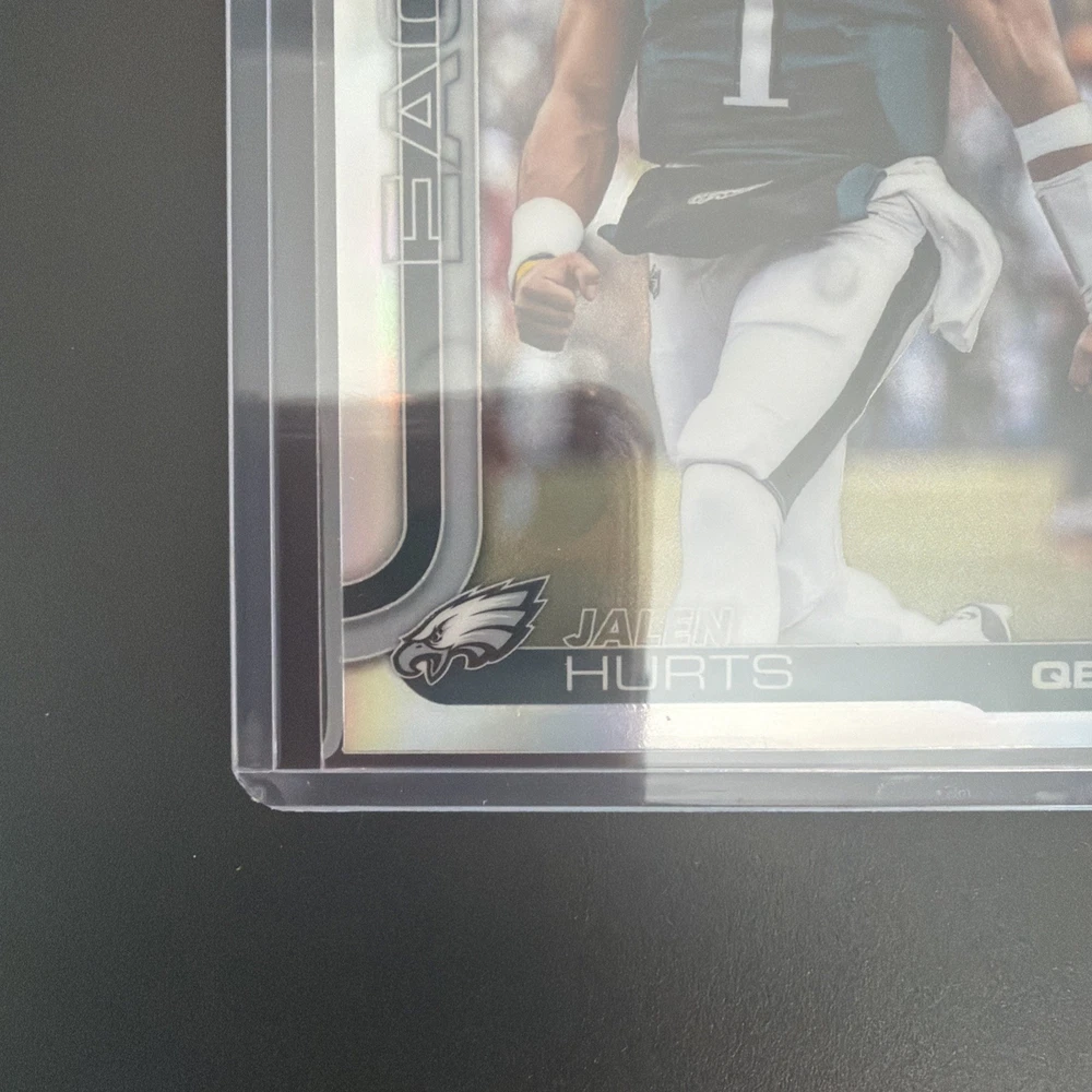 The product is a 2025 Topps Chrome Football Image Variation Refractor card featuring Philadelphia Eagles player Jalen Hurts. This original sports trading card is a short print with a parallel/variety design, made of card stock material, and is part of the National Football League (NFL) set for the 2025 season. The card is in near mint or better condition and is ungraded, showcasing Jalen Hurts in his Eagles uniform, making it a desirable collectible for fans and collectors alike.