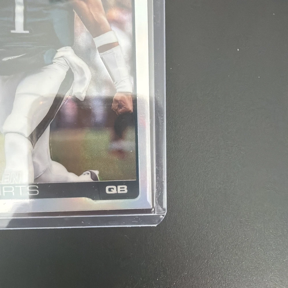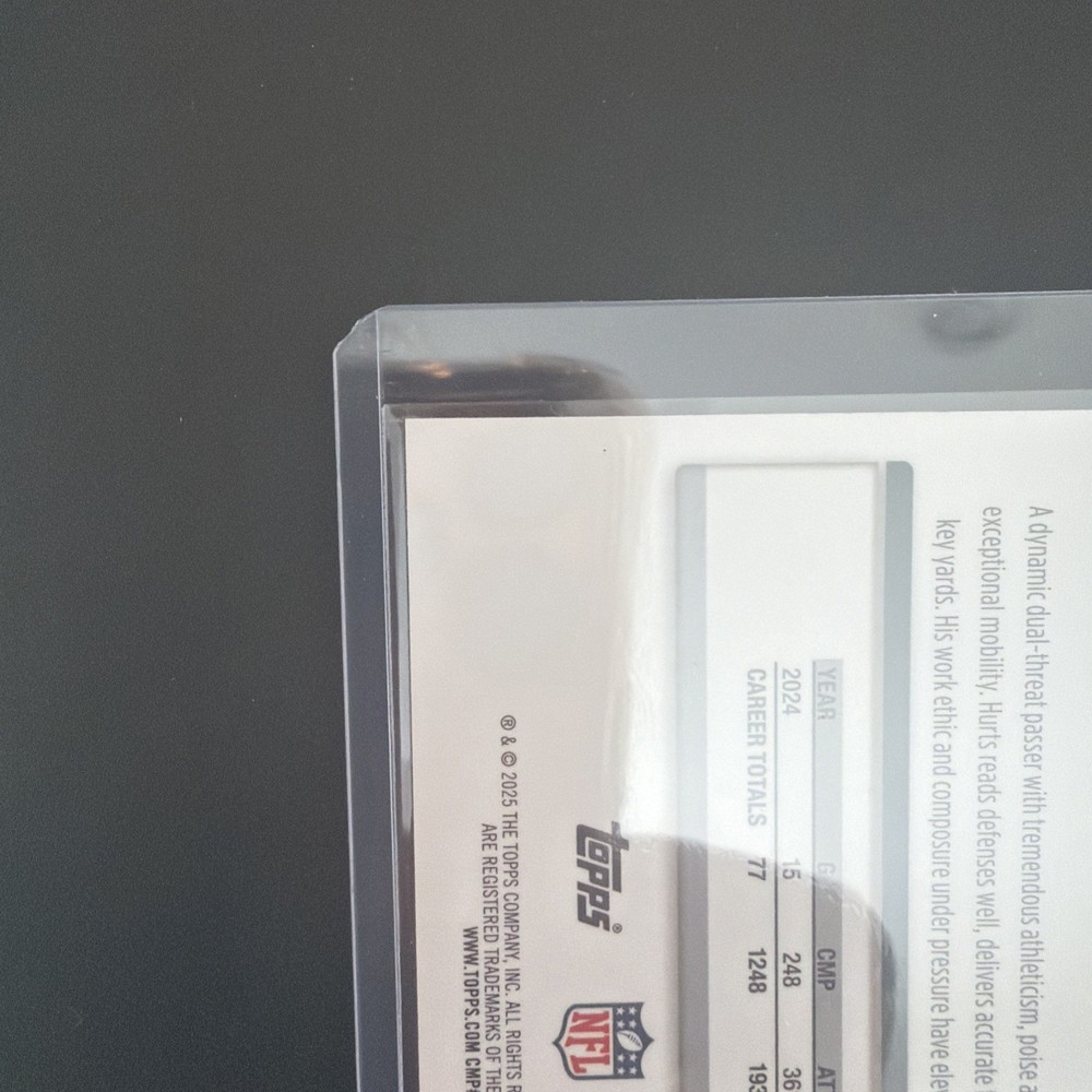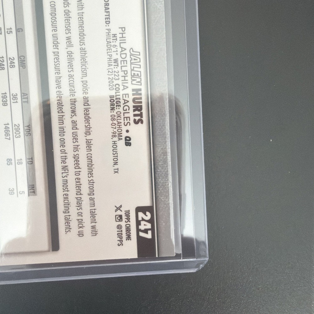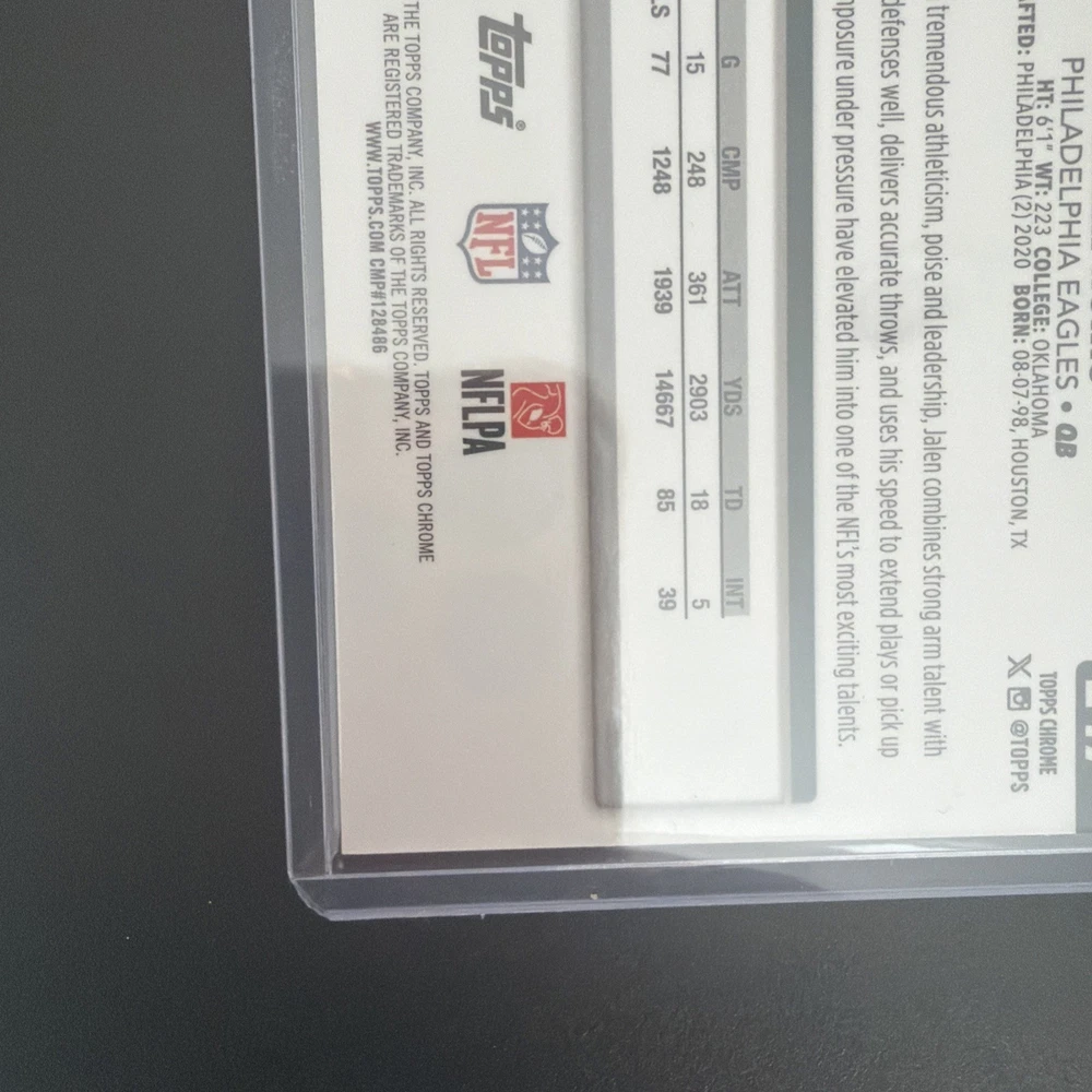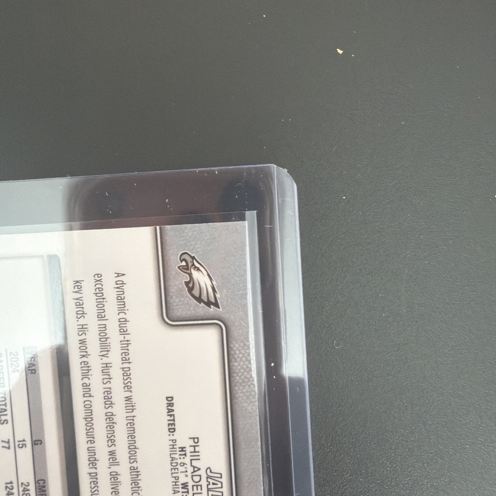 The product is a 2025 Topps Chrome Football Image Variation Refractor card featuring Philadelphia Eagles player Jalen Hurts. This original sports trading card is a short print with a parallel/variety design, made of card stock material, and is part of the National Football League (NFL) set for the 2025 season. The card is in near mint or better condition and is ungraded, showcasing Jalen Hurts in his Eagles uniform, making it a desirable collectible for fans and collectors alike.