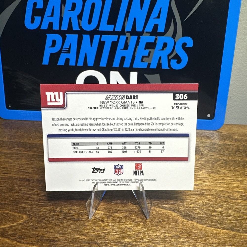 The product is a 2025 Topps Chrome Football trading card featuring Jaxson Dart of the New York Giants, part of the Ray Wave Refractor parallel set. This standard-sized card is made of 35 Pt. card stock and is in English language. It is a rookie card with a card number of 306, manufactured by Topps and authenticated by Topps. This collectible item is an original and not a reprint, and it is part of the National Football League (NFL) league for the 2025 season.