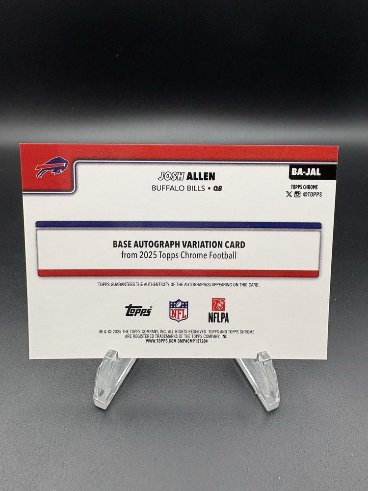 The product is a 2025 Topps Chrome Football trading card featuring an on-card autograph of Josh Allen from the Buffalo Bills. This card is an original hard-signed autograph on standard card stock, part of the base set with a chrome finish. It is officially licensed by the National Football League (NFL) and manufactured by Topps in the United States. A valuable collectible for any football card enthusiast or fan of Josh Allen and the Buffalo Bills.
