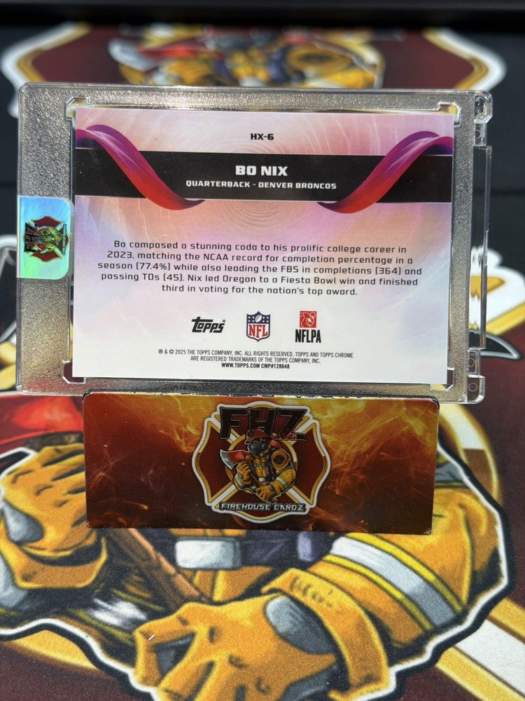 Pulled from a 2025 Topps Chrome Football hobby box, this is a Bo Nix Super Short Print (SSP) case hit featuring one of the most electric rookie QBs in the class. This card showcases a stunning, vibrant design with eye-catching color flow and premium chrome finish—one of the toughest pulls in the entire product