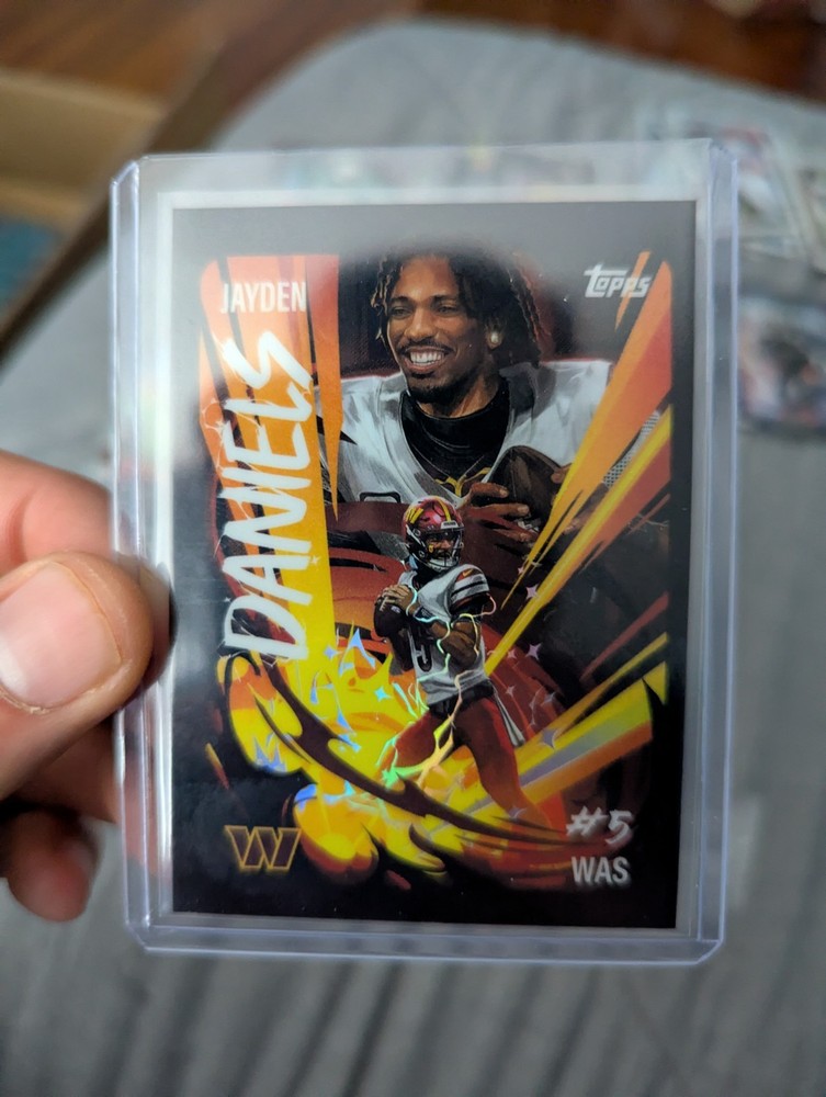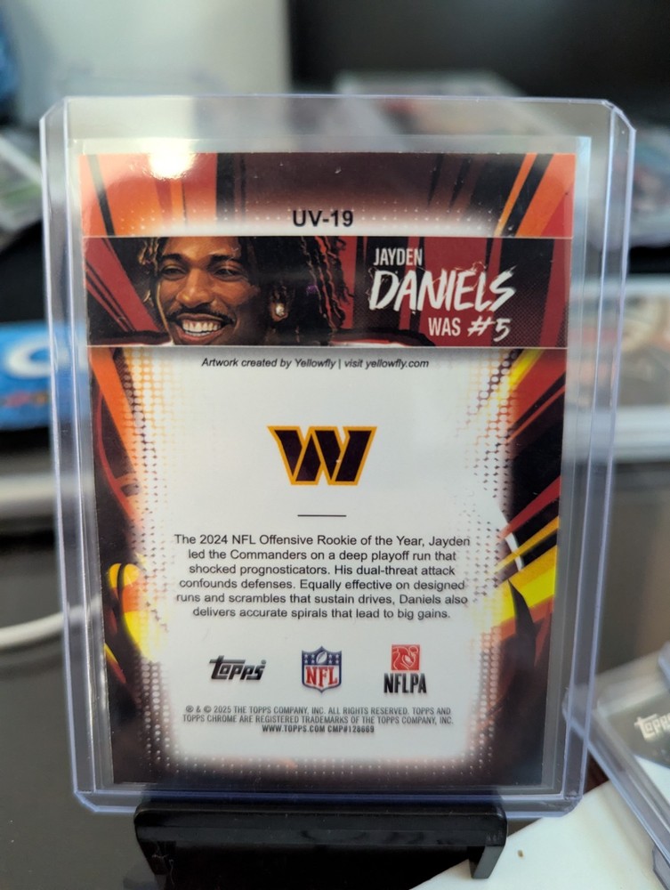 The 2025 Topps Chrome Jayden Daniels UV-19 Washington Commanders Ultra Violet SSP trading card is a highly sought-after collectible featuring the rookie quarterback in the National Football League. This original card manufactured by Topps is made of card stock with a chrome finish, showcasing the player in his Washington Commanders uniform. With a limited print run and being part of the ssp series, this card is in near mint condition or better, making it a valuable addition to any sports trading card collection.