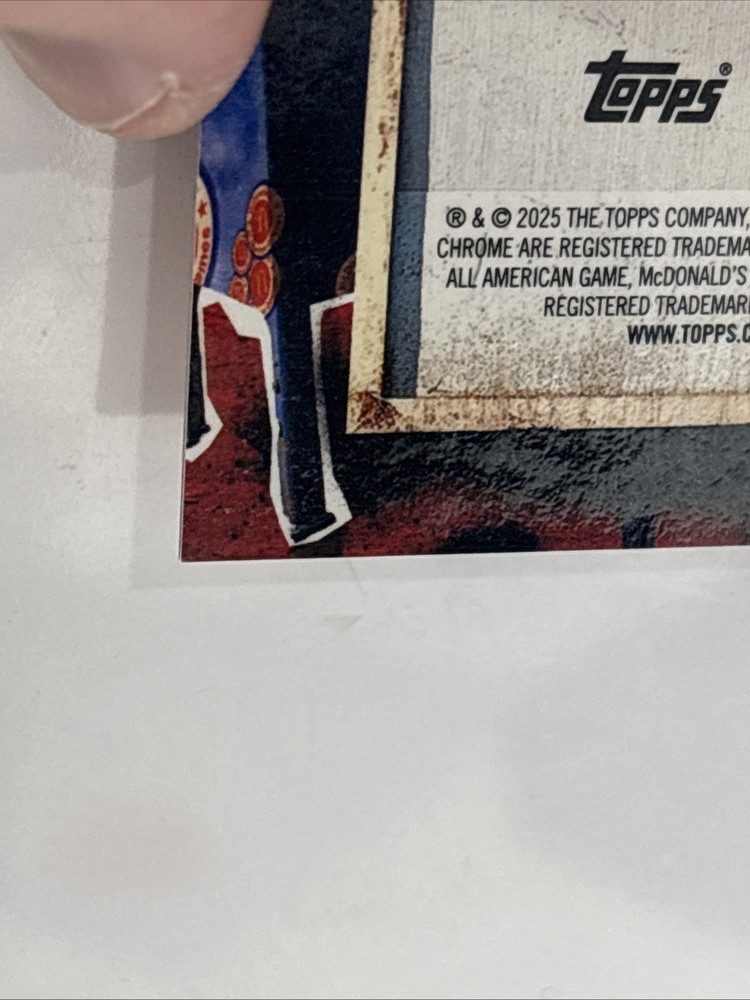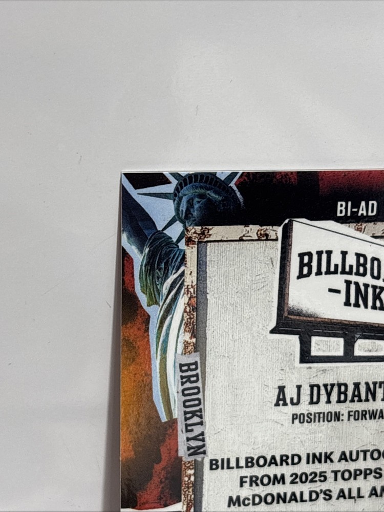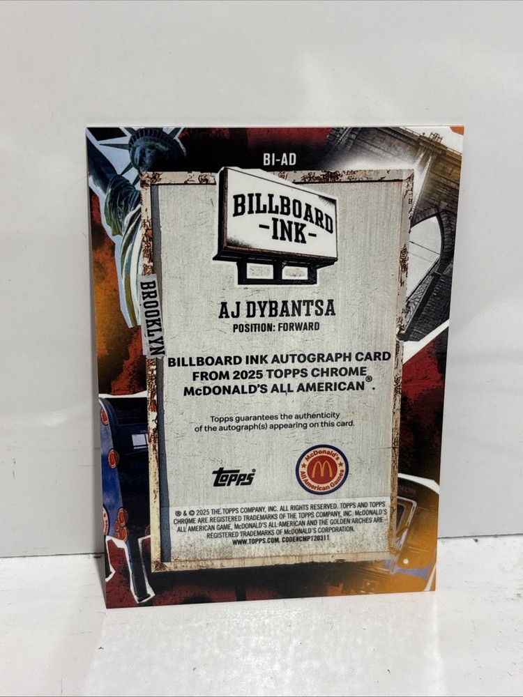 The product is a rare and highly sought-after 2025 Topps Chrome McDonald's AJ Dybantsa autographed trading card featuring the Billboard Ink design. This limited edition card is numbered out of 15 and comes directly from the manufacturer, Topps. The card is made of high-quality card stock and is part of the NCAA basketball set, making it a valuable addition to any sports trading card collection. With its unique design, autograph authentication, and serial numbering, this card is sure to be a standout piece for fans and collectors alike.