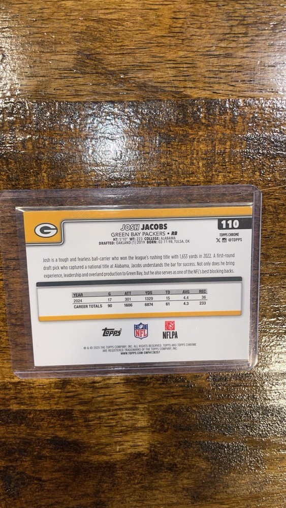 The product is a rare 2025 Topps Chrome NFL trading card featuring Josh Jacobs of the Green Bay Packers. This specific card is a color match variation numbered 53/99, making it a highly sought-after collectible for fans of football and sports trading cards. With an original print run of 99, this card is in near mint condition and is a must-have for any avid collector looking to add a unique piece to their collection.