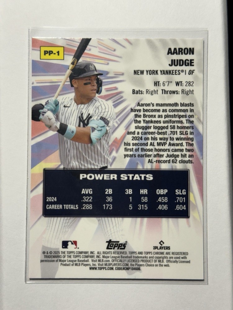 The 2025 Topps Chrome Power Players Aaron Judge #PP-1 trading card is a sought-after collectible featuring the star baseball player from the New York Yankees. Produced by Topps, this sports trading card is part of the 2025 Topps Chrome set and belongs to the Power Players insert set. This baseball card showcases Aaron Judge as a key player in Major League Baseball, making it a valuable addition to any sports memorabilia collection. Fans of the sport and collectors alike will appreciate the unique design and limited availability of this special card.