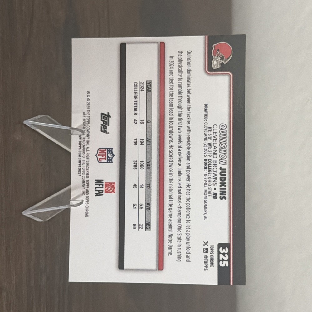 The product is a 2025 Topps Chrome Quinshon Judkins Purple Pigskin Rookie Card (RC) featuring the Cleveland Browns player. This sports trading card is serial numbered out of 75 and belongs to the Purple Pigskin parallel variety. Manufactured by Topps, the card is in near mint or better condition and is an ungraded rookie card from the National Football League (NFL) set. Perfect for collectors and fans of football trading cards, this limited edition card is a valuable addition to any collecion.