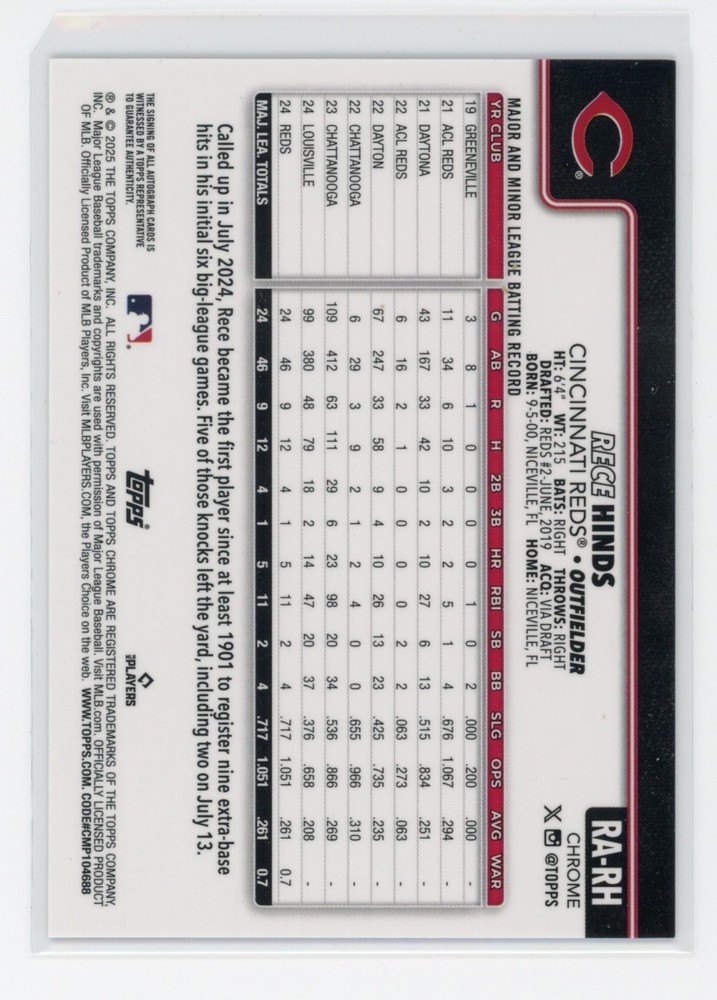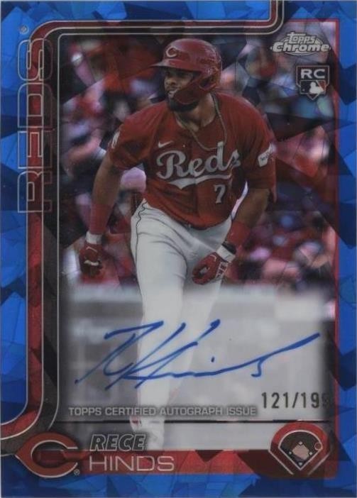 The product is a Topps 2025 Chrome Sapphire Rece Hinds Rookie Autograph trading card, signed by the MLB player Rece Hinds. This limited edition card is part of the Rookie Autographs insert set and features a hard-signed autograph on a standard-sized card stock. Authenticated by Topps and graded by Professional Sports Authenticator (PSA), this card is a valuable collectible for fans of the Cincinnati Reds and baseball enthusiasts alike. With a print run of 199, this rare sports trading card is a must-have for collectors looking to add a unique piece to their collection.