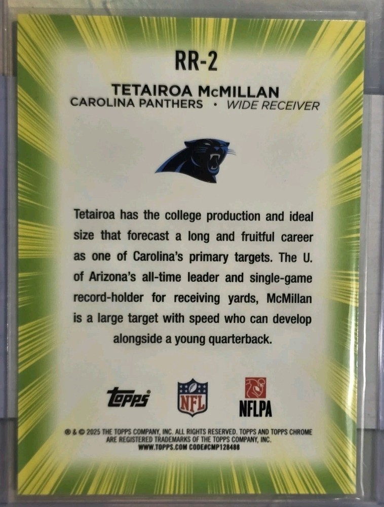 The product is a 2025 Topps Chrome Tetairoa McMillan Radiant Rookies #RR-2 SSP Case Hit trading card featuring the player from the Carolina Panthers in the National Football League (NFL). This card is a rare parallel variety called Refractor made of card stock material. It is part of the Radiating Rookies set by manufacturer Topps, focusing on highlighting rookie players in the 2025 season. This highly collectible card would be a valuable addition to any football trading card collection.